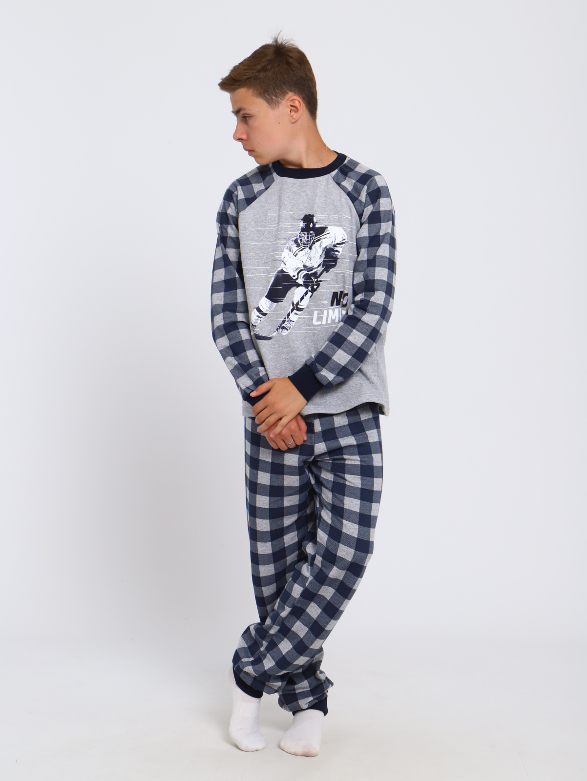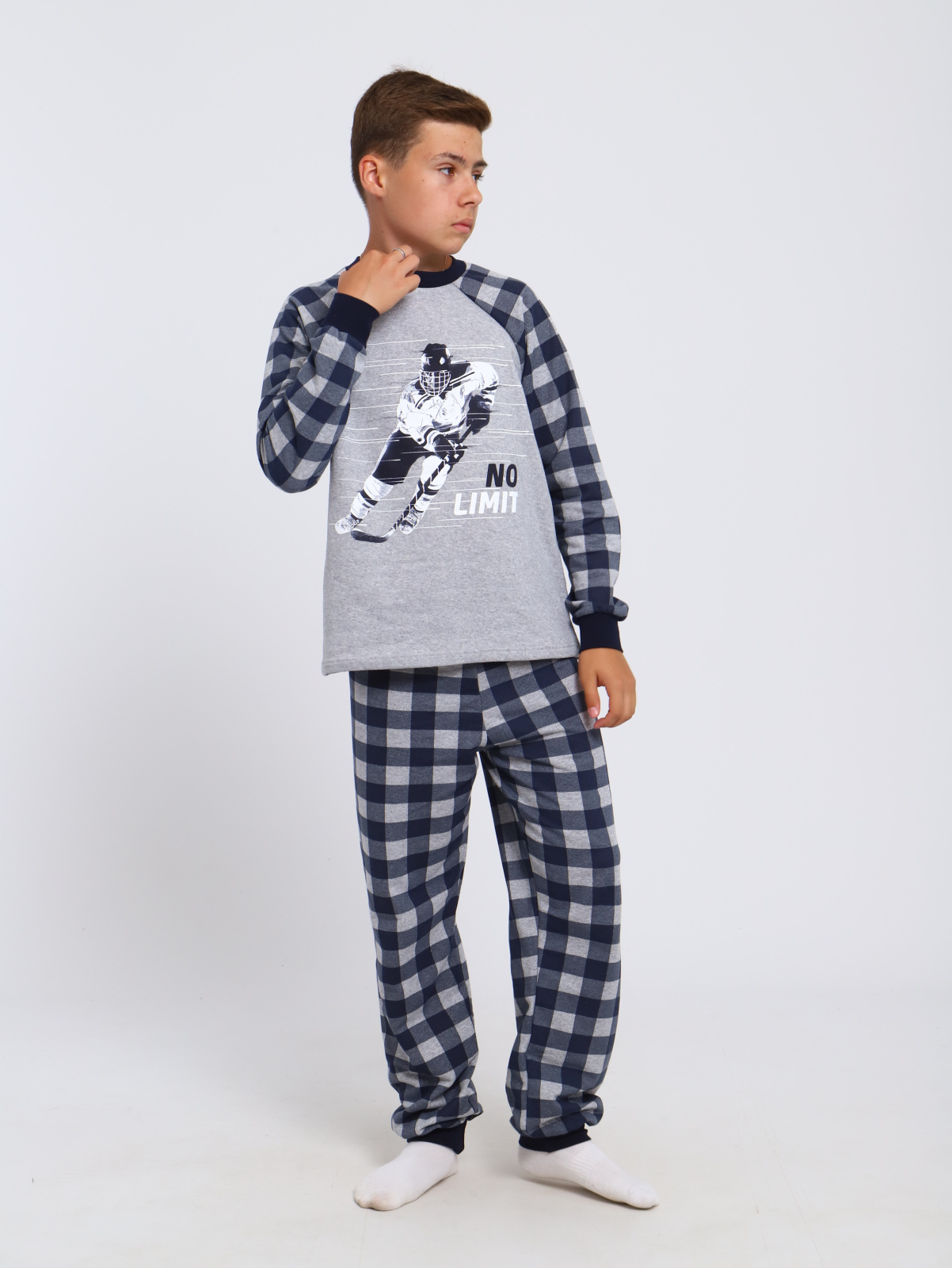 Домашний утепленный комплект для мальчиков со спортивным принтом «хоккеист» из натурального хлопкого материала с небольшим начесом. Костюм для дома может использоваться как домашняя одежда и в качестве пижамы для сна и отдыха. Комплект состоит из кофты с длинным рукавом с комбинированным принтом и штанишек в клетку, выплнен в сдержанной серо-синей гамме. Костюм пошит в свободном полуприлегающем стиле, без карманов для полного комфорта ребенка во сне. Штаны в талии легко регулируются при помощи эластичной резинки. Манжеты на рукавах и штанах придают дополнительное удобство при носке. Пижама отлично подойдет для сна, в такой домашней одежде удобно отдыхать, играть, заниматься уроками или домашними делами в любое время года. Качество ткани, принта и пошива пижамы будет радовать своим первоначальным видом несколько сезонов. Теги: пижама теплая, пижама утепленная, пижама с начесом, пижама для девочки, пижама для мальчика, пижама детская, пижама трикотажная, пижама детская для мальчика, пижама для дома, пижама с принтом, пижама для сна, костюм для сна и отдыха, костюм домашний, комплект домашний, комплект для дома, одежда для дома