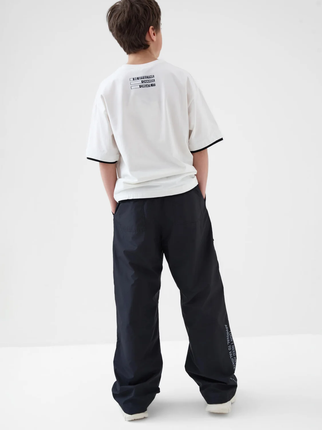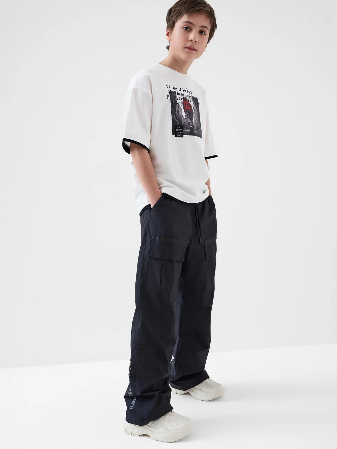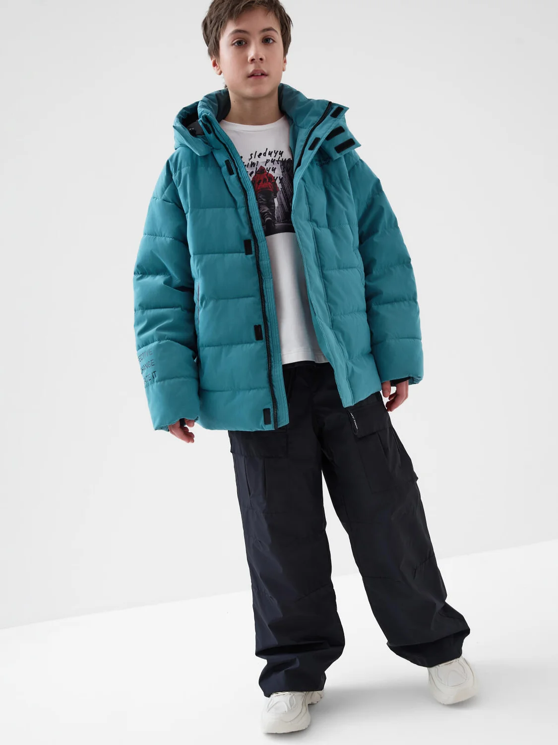 Брюки для мальчика подростка. Выполнены из плотной ткани с ветрозащитным и водоотталкивающим покрытием. Модель свободного прямого кроя со средней посадкой. Боковые карманы. На брючинах большие накладные карманы с клапанами, сзади — два кармана. Пояс на резинке с утягивающим шнурком. Внизу штанин предусмотрена регулировка объема с помощью эластичного шнура. На одном из боковых карманов — фирменный жаккардовый шеврон, а на задней штанине — вертикальный принт с мотивационной надписью. Внутри — мягкая подкладка из флиса и таффеты.