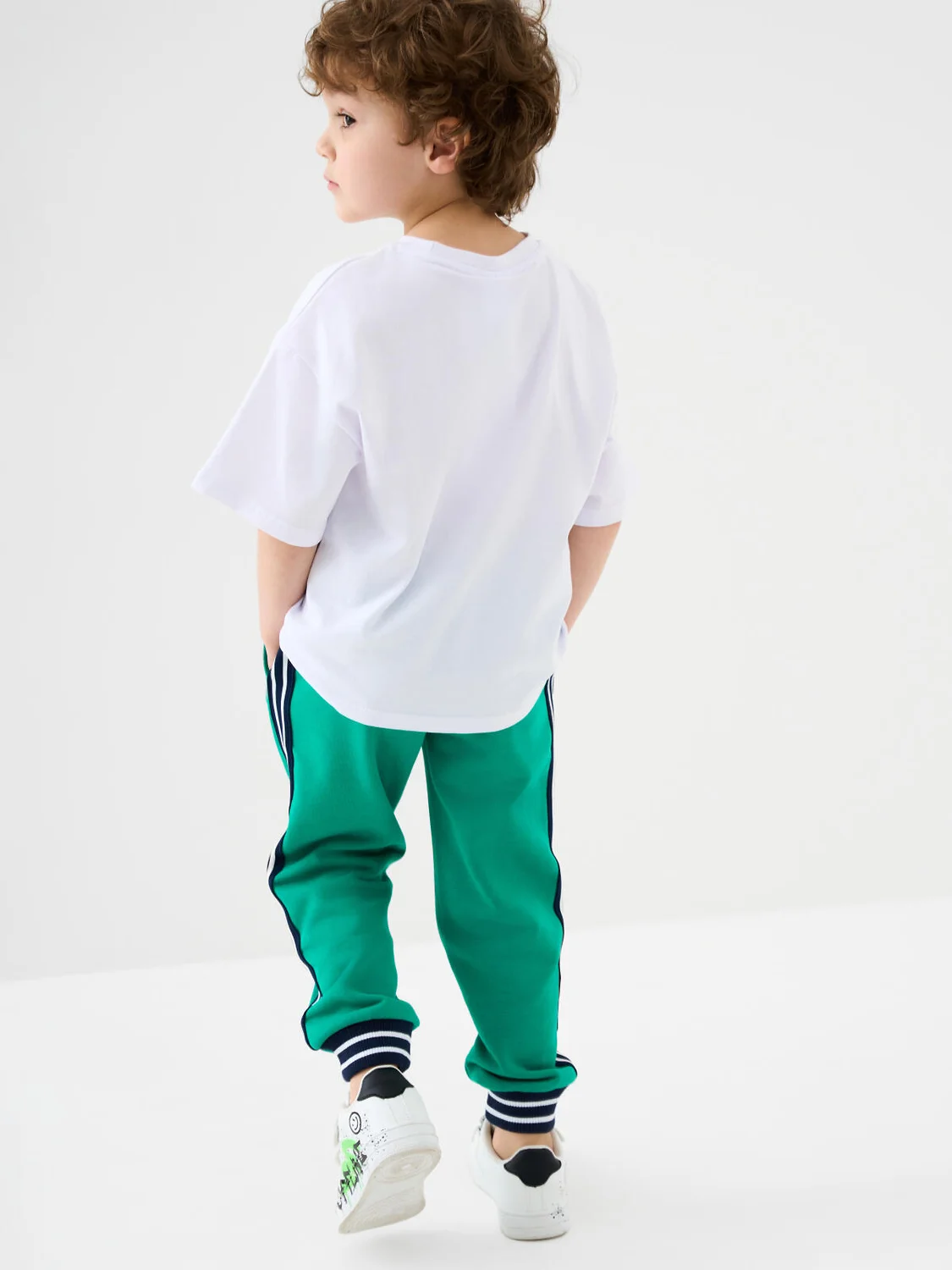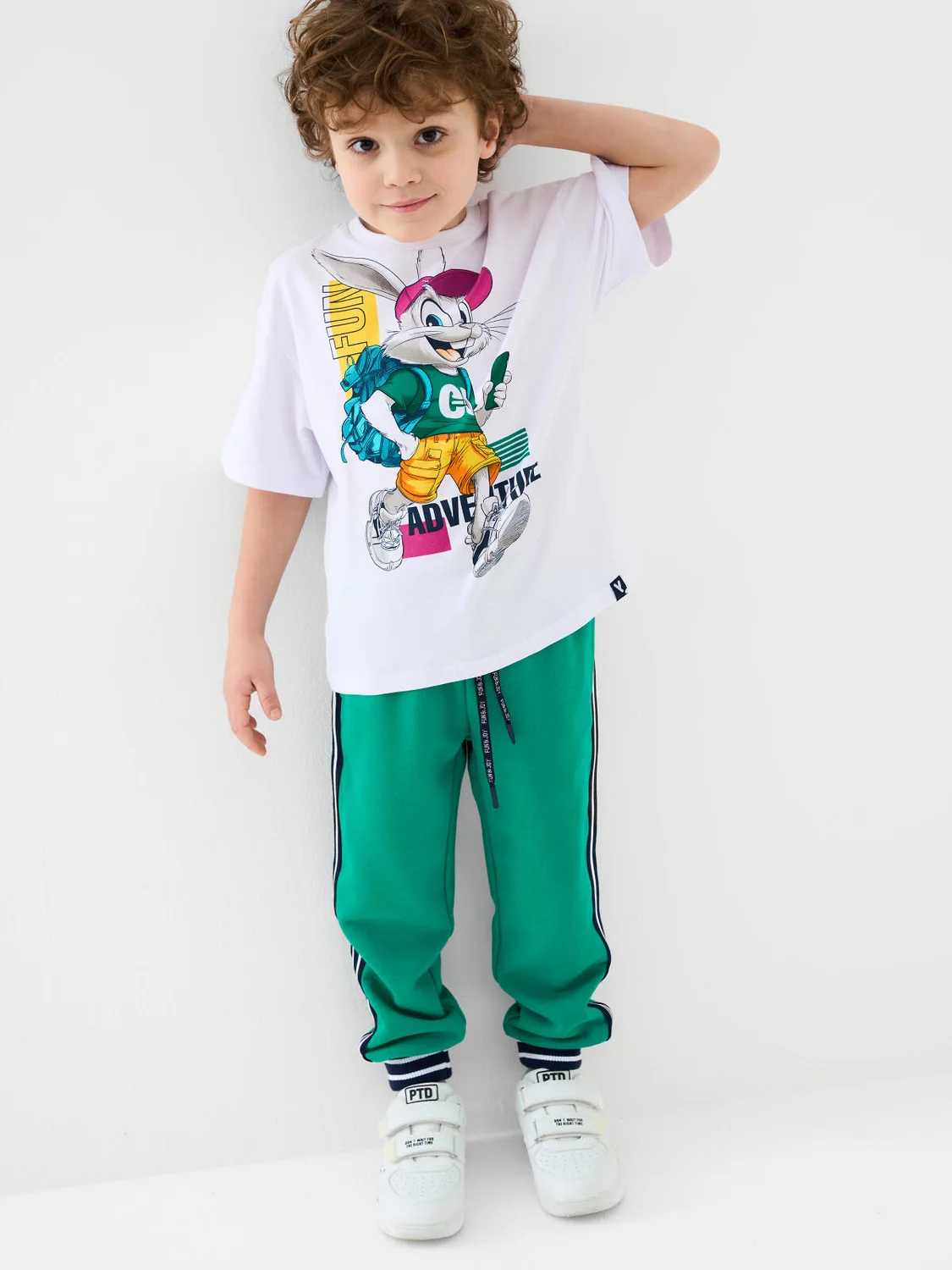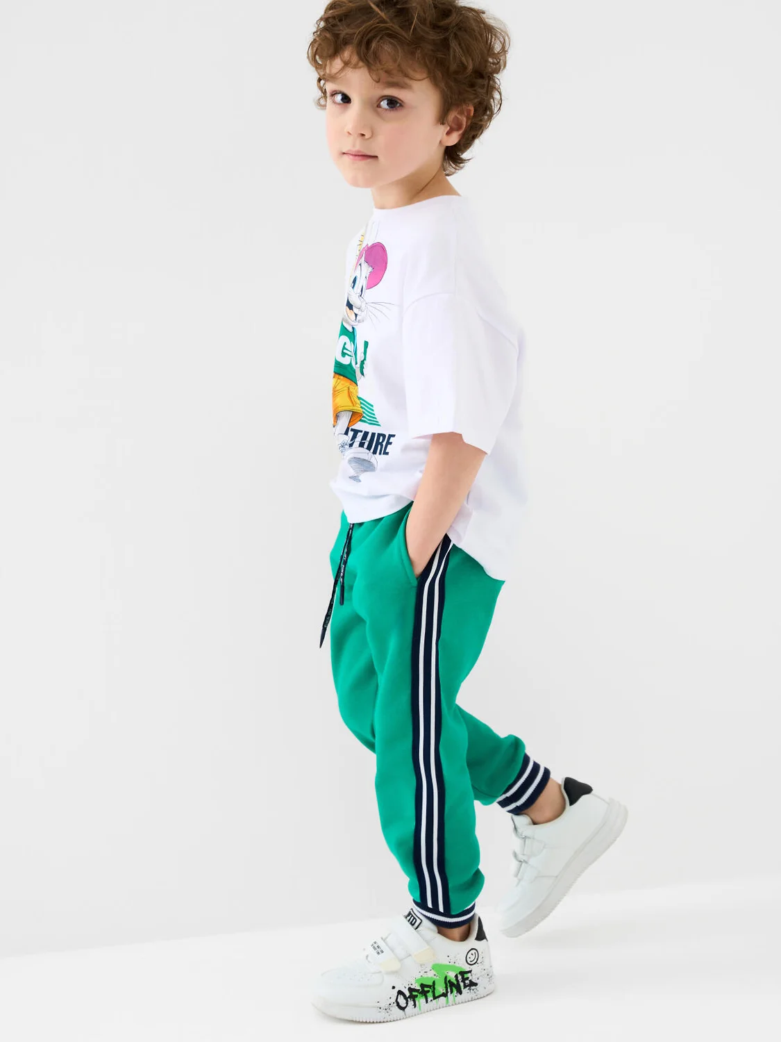 Брюки-джоггеры детские для мальчика. Выполнены из хлопкового трикотажа футер без начеса. Модель прямого кроя со средней посадкой на талии. Пояс выполнен на резинке, дополнительно регулируется шнурком. По бокам — удобные карманы. В нижней части брючин предусмотрены эластичные трикотажные манжеты для лучшей фиксации. Штаны украшены лампасами по бокам.