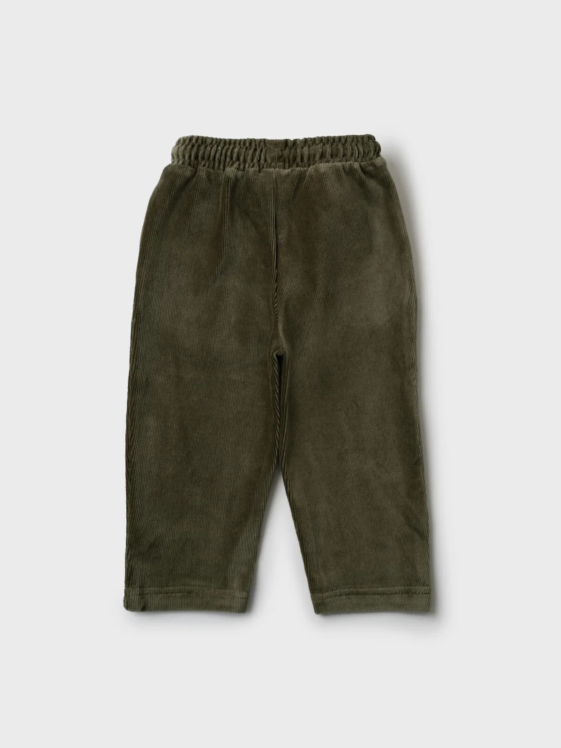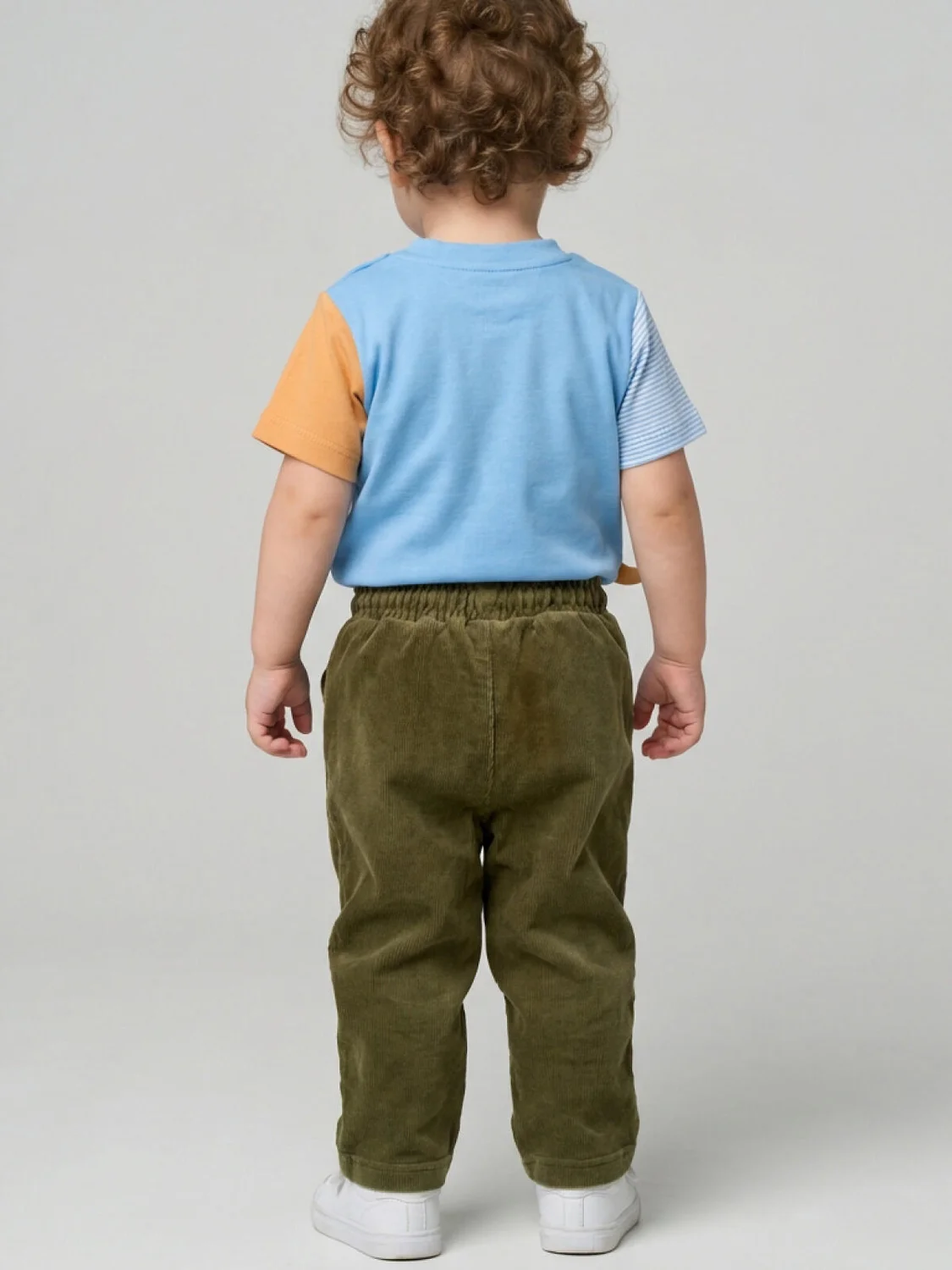 Детские брюки для мальчика. Модель прямого силуэта, выполнена из мягкого хлопкового вельветового трикотажа. У брюк высокий комфортный пояс на широкой резинке и шнурок для регулировки. Спереди — два удобных кармана. Декоративная нашивка, а на левом кармане — съемный брелок в виде тигренка.
