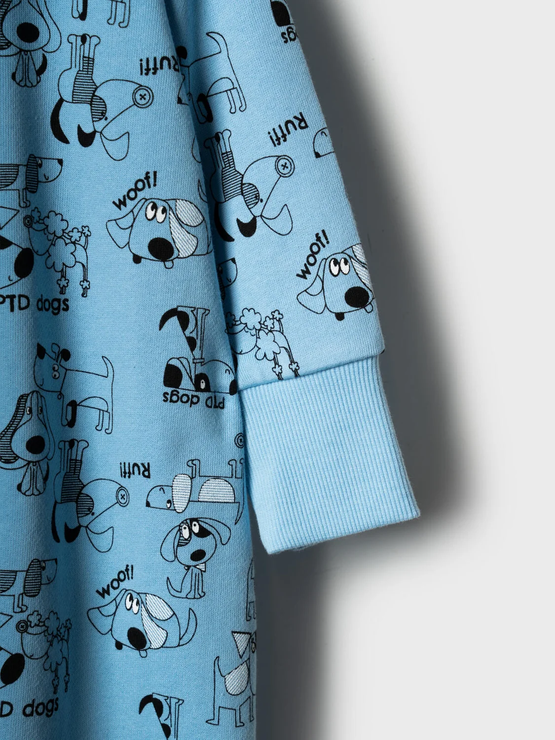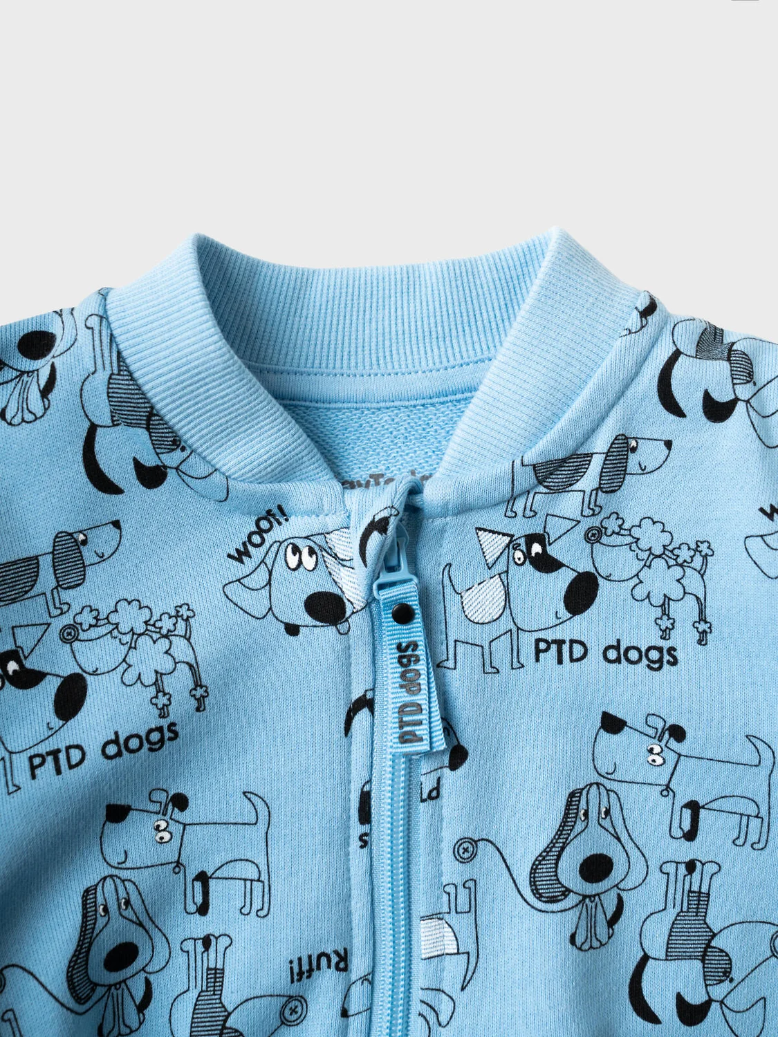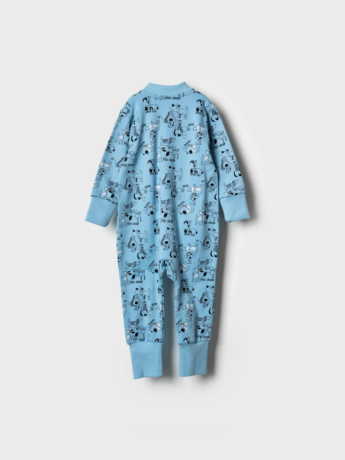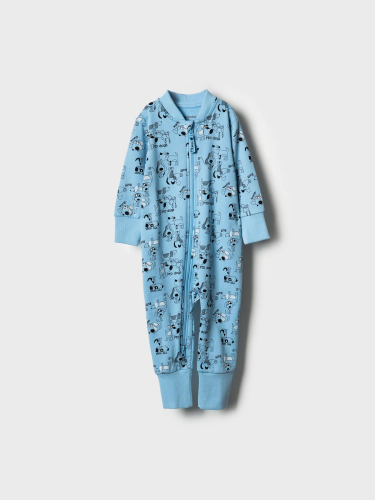 Детский комбинезон для новорождённого мальчика. Выполнен из мягкого, хлопкового трикотажа. Дизайн - весёлые принты с собаками. У комбинезона длинные рукава и штанишки, а манжеты на них выполнены из рельефного риба. Застёгивается на удобную молнию, которая идёт по диагонали, что облегчает переодевание малыша. Горловина круглая, также отделана рибом.
