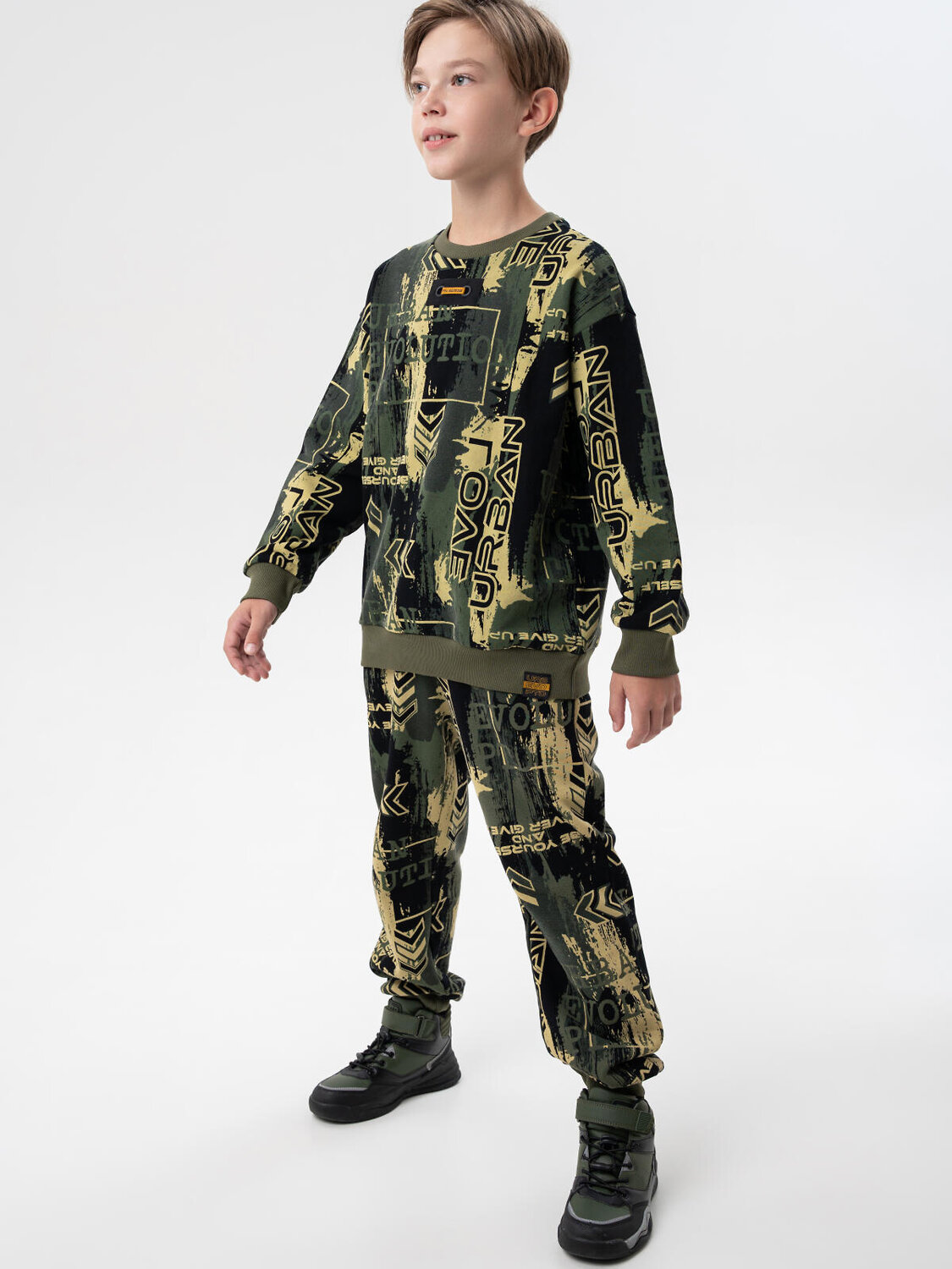 Сочетайте камуфляжный подростковый свитшот с чёрными спортивными брюками или джинсами PlayToday для модного повседневного образа. В школу дополняйте комплект строгими брюками бренда.