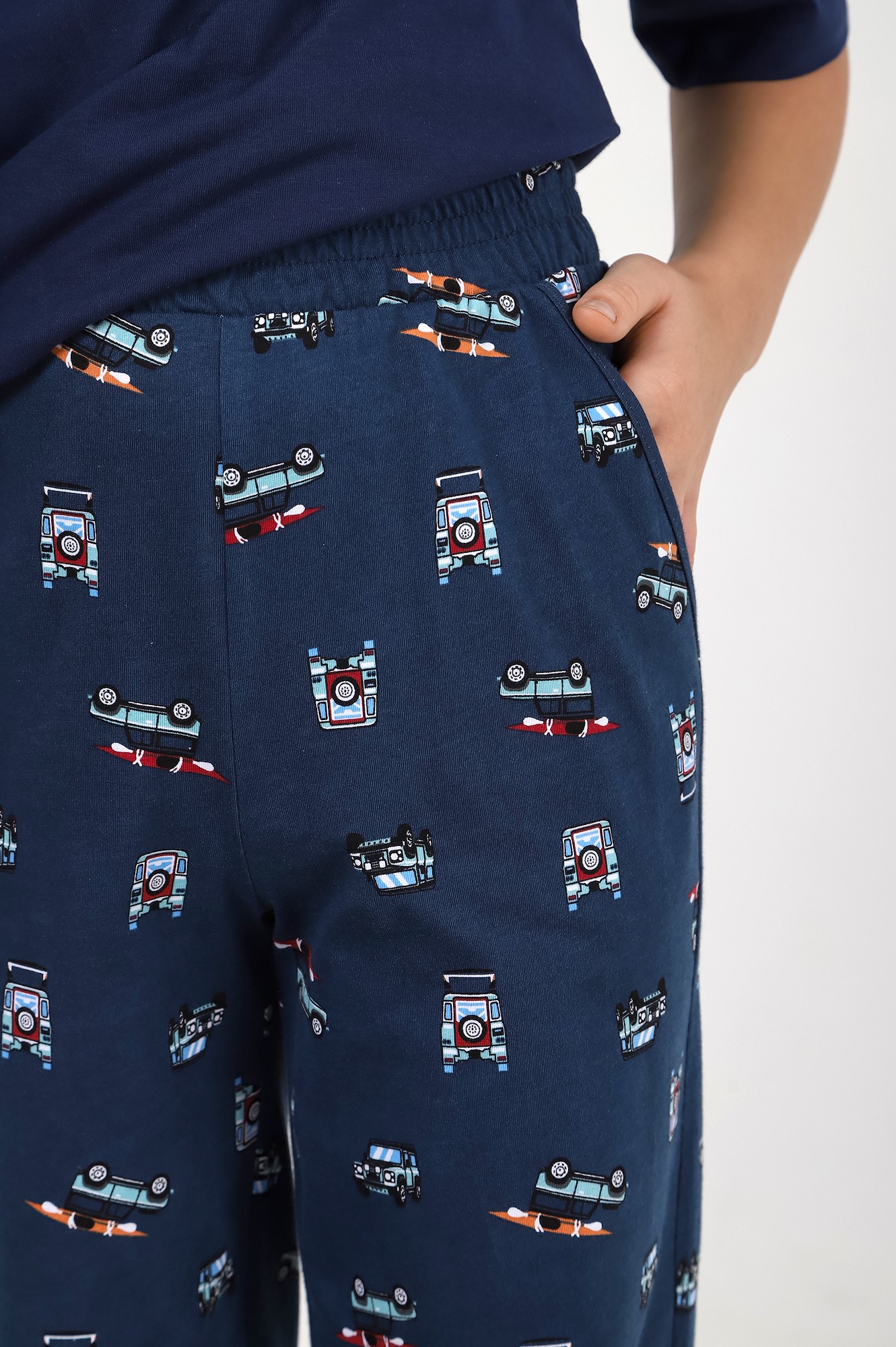 Костюм для мальчика ,состоящий из футболки и брюк. Футболка - из гладкокрашеного полотна "кулирка", классического покроя, с короткими втачными рукавами, горловиной овальной формы, обработанной втачной планкой, и принтом вцентре переда, выполненным в технике шелкографии. Брюки - из полотна с набивным рисунком, прямого силуэта, на притачном поясе с эластичнойтесьмой внутри и карманами в боковых швах, входы в которые окантованы основным материалом.
