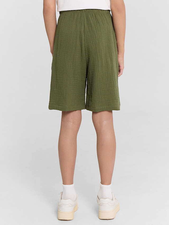 Шорты для мальчиков из ткани (муслин). Шорты с классической линией талии. Силуэт прямой. Пояс цельнокроеный. Верхний срез шорт застрочен с эластичной тесьмой. Карманы в боковых швах (хулиганы). На внешней стороне пояса пробиты петли, втянут шнур из основного полотна. Низ шорт обработан швом в подгибку.