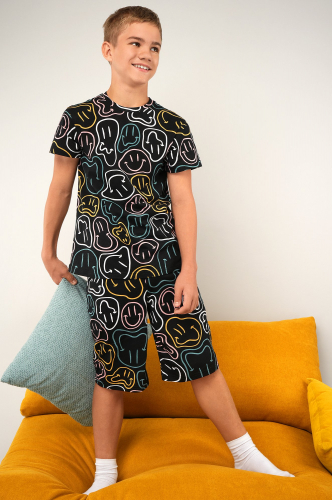 Черный костюм со смайликами подходит для сна и отдыха. Подростковый трикотажный костюм идеален для дома.