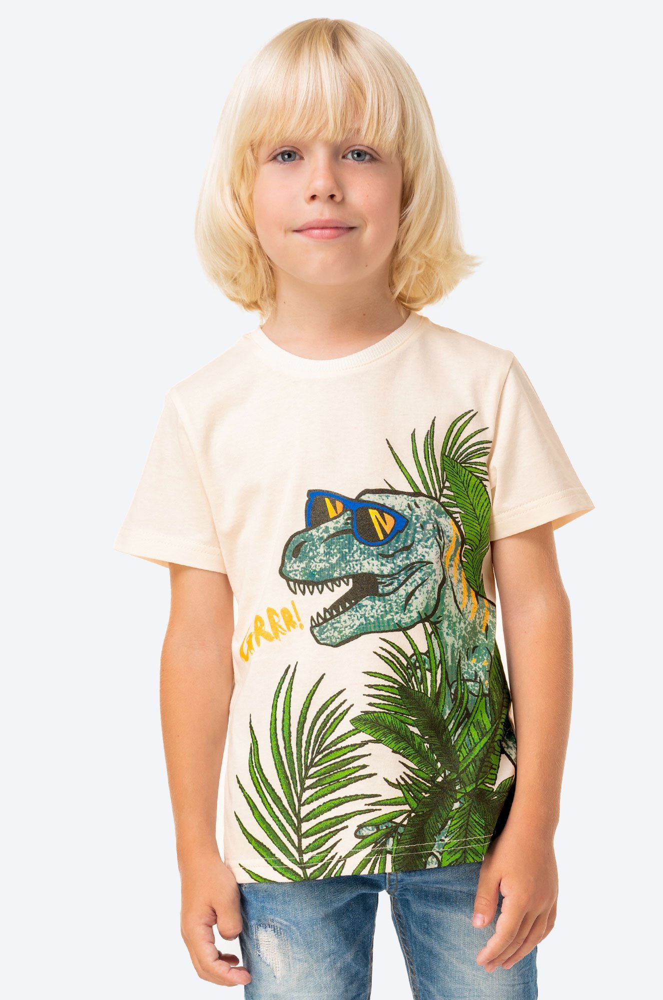 Детская футболка с принтом Динозавр выполнена из 100% натурального хлопка, ткань кулирная гладь. Бежевая футболка классического прямого кроя актуальна не только летом, но и круглый год.