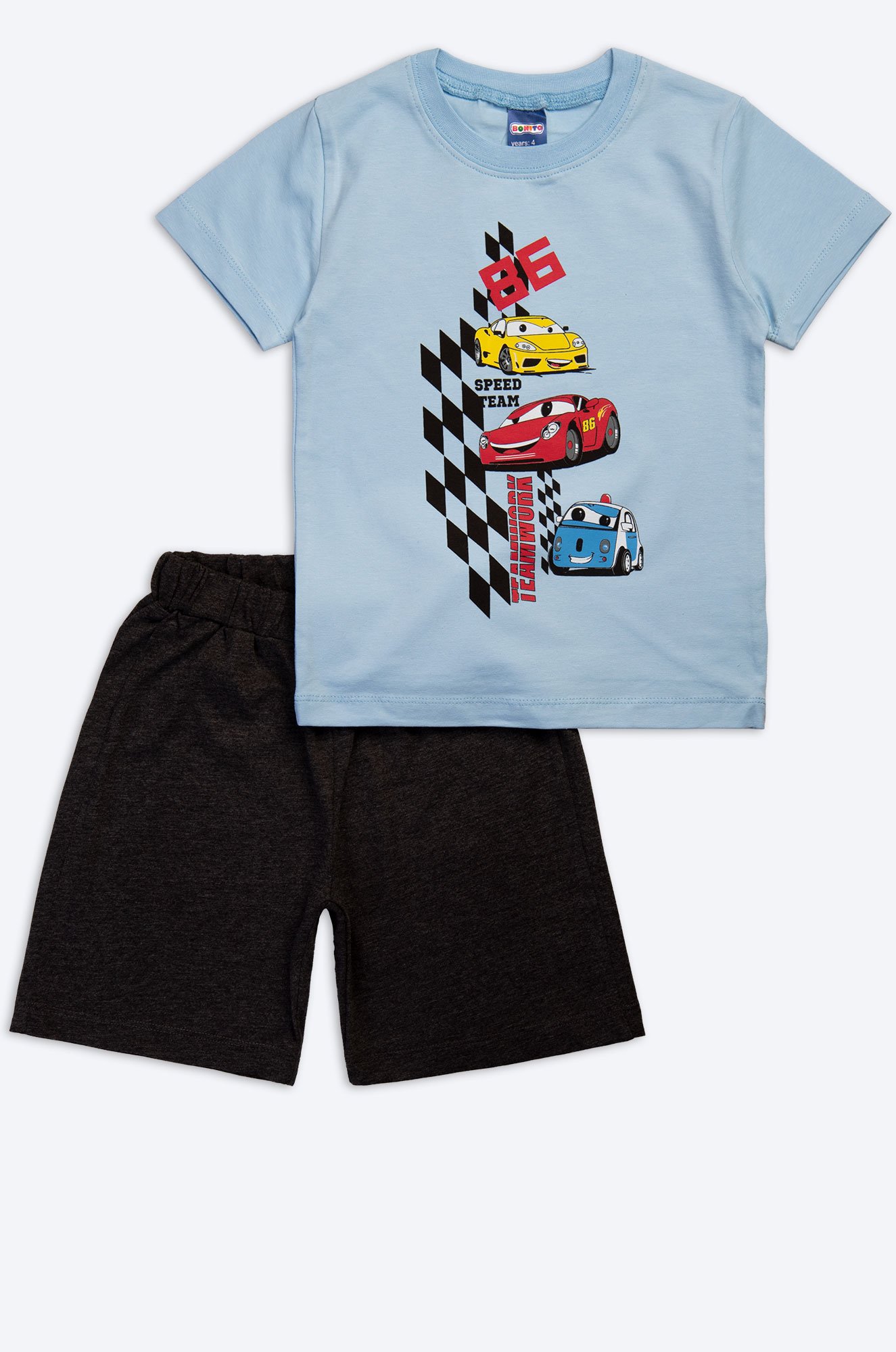 В комплект входят футболка с принтом Машины и однотонные шорты с эластичным поясом на резинке.