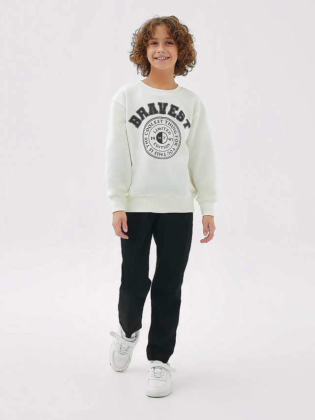 Стильный свитшот для мальчиков выполнен из футера без подчеса. В составе изделия - высококачественный хлопок. Модель свободного силуэта. Горловина округлой формы из рибаны. Рукава втачные, длинные, с отрезными манжетами. По низу джемпера отрезной пояс из рибаны. Комфортный и уютный вариант для создания лаконичных городских образов. Дополнить такой детский свитшот можно любым низом на свой вкус. Широкий размерный ряд. Рекомендуем!