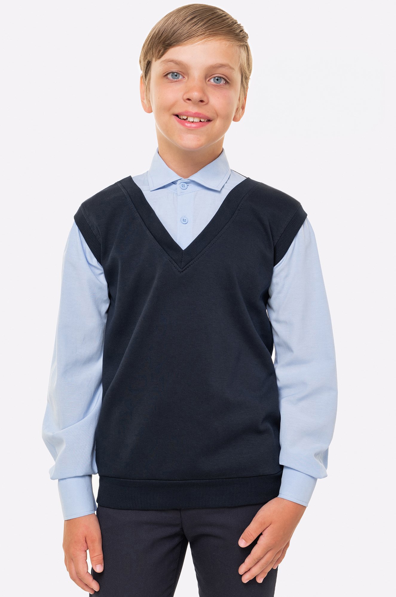 Джемпер из трикотажа станет идеальным дополнением к школьной форме для детей. Классический джемпер поможет создать образ в деловом стиле не только для школы, но и для торжественных мероприятий. Демисезонный синий жилет с голубой рубашкой станет идеальным вариантом для прохладной осени, весны и морозной зимы.