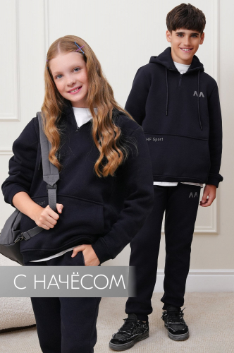 В костюм входит толстовка-зипка на молнии и брюки джоггеры с регулируемым поясом. Кофта со шнурком на капюшоне и карманами на молнии надёжно защитит от ветра, а штаны со слегка зауженным низом смотрятся стильно и удобно сидят. Зимний спортивный костюм идеально подойдёт для подростков: он комфортен для активного дня на улице и практичен для занятий спортом и физкультурой в холодное время года.