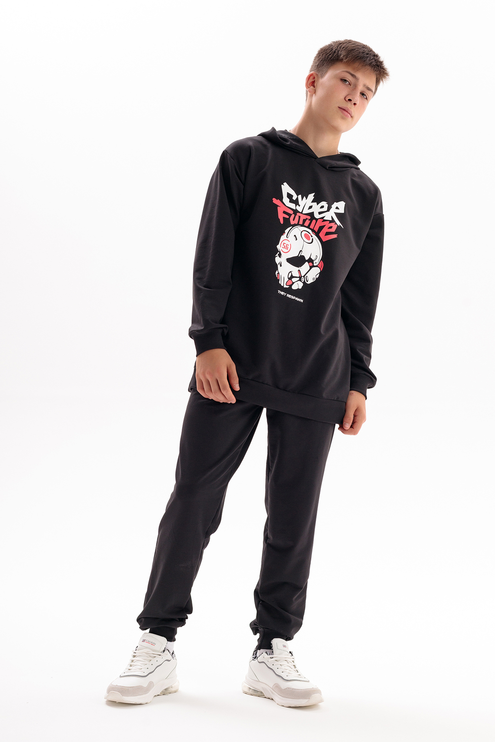 Спортивный костюм с брюками джоггерами для вашего подростка. Откройте новые горизонты комфорта и стиля для вашего ребенка с оригинальным спортивным костюмом, состоящим из удлиненной толстовки с глубоким капюшоном и джоггеров. Этот костюм, выполненный в оверсайз стиле, станет идеальным дополнением к гардеробу любого мальчика или подростка, ценящего удобство и модные тенденции. Изготовленный из дышащего материала на основе хлопка 75%, костюм обеспечивает комфорт в теплую осень и лето, будь то активные занятия спортом, игра в баскетбол, катание на велике, скейте или самокате. Модный спортивный костюм для мальчиков является отличным вариантом школьной формы для физкультуры. Цвет: черный; Материал: футер 2-х нитка;футер 2-х нитка; Состав: 75% Хлопок 25% Полиэстер.