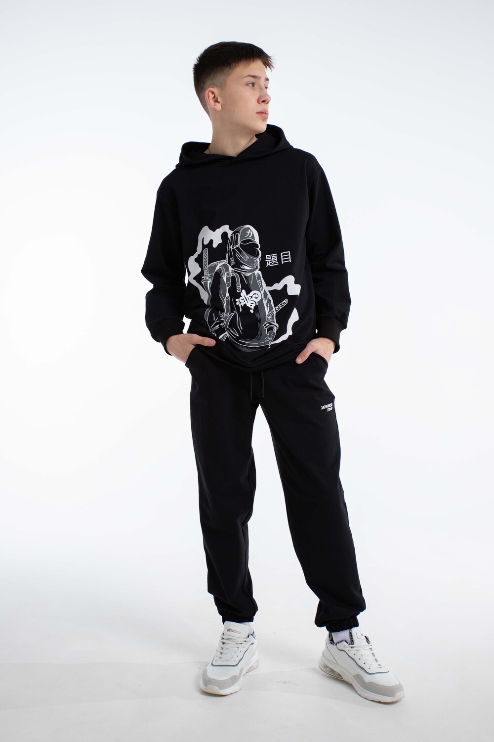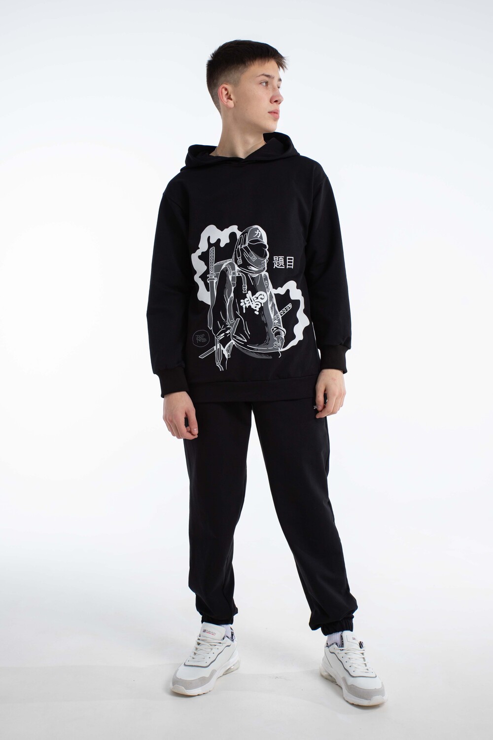 Спортивный костюм в стиле y2k с джоггерами для вашего подростка. Откройте новые грани комфорта и моды для ребенка с оригинальным демисезонным костюмом, состоящим из удлинённой толстовки с глубоким капюшоном и джоггеров. Этот детский осенний комплект без начеса, выполненный в оверсайз, станет отличным дополнением гардероба любого мальчика или подростка, который ценит удобство и современные тенденции. Изготовленный из дышащего хлопкового материала, костюм обеспечивает комфорт в тёплую осень, весну и зиму с верхней одеждой, будь то активные занятия спортом, баскетбол, велопрогулки, скейт или катание на самокате. Такой спортивный костюм для мальчиков отличный вариант школьной формы для физкультуры.Эта спортивная вещь подойдет и для повседневного использования: прогулки с друзьями, походы в лагерь или отпуск у моря. Черный цвет добавляет универсальности, позволяя сочетать костюм с разными элементами гардероба для создания разнообразных повседневных образов. Оверсайз толстовка с капюшоном и штаны с идеальной посадкой не restrict движения, обеспечивая комфорт во время активного отдыха и занятий спортом. Цвет костюма насыщенный черный с оригинальным принтом, который выделяет стиль и подчёркивает индивидуальность, делая вашего мальчика заметным среди сверстников. Этот комплект станет надёжным выбором для тех, кто ищет сочетание комфорта, стиля и универсальности в подростковой одежде. Таким образом, выбирая наш спортивный костюм, вы предоставляете вашему мальчику или подростку идеальный баланс комфорта, стиля и практичности. Цвет: черный; Материал: футер 2-х нитка;футер 2-х нитка; Состав: 75% Хлопок 25% Полиэстер.