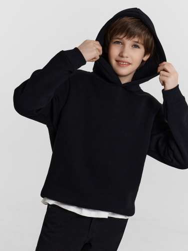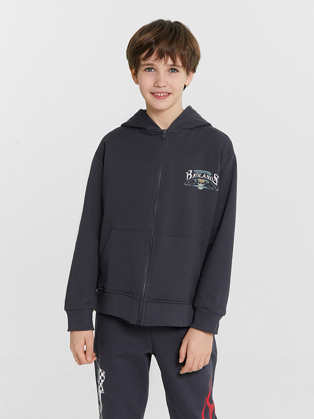 Жакет для мальчиков прямого силуэта с капюшоном. Капюшон на подкладке из основного полотна. Шов втачивания капюшона закрыт х/б тесьмой. Рукава втачные, линия плеча спущена. Притачные манжеты по низу рукавов и притачной пояс из рибаны. По переду застежка молния, карман кенгуру.