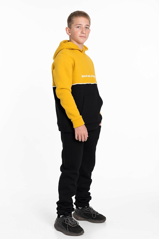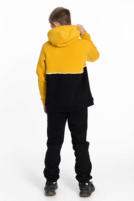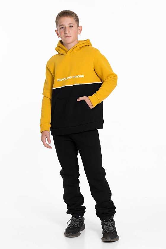 Толстовка для мальчика из футера 3-х нитки с начесом в двухцветном исполнении: горчичный и чёрный. Толстовка прямого кроя с длинным рукавом идеально подойдет для повседневной носки, добавит яркости и стиля в гардероб мальчика. Принт на верхней части полочки придаст дополнительный акцент и интересный вид. Капюшон поможет защитить голову от ветра и холода, а карман-кенгуру станет удобным местом для различных мелочей.