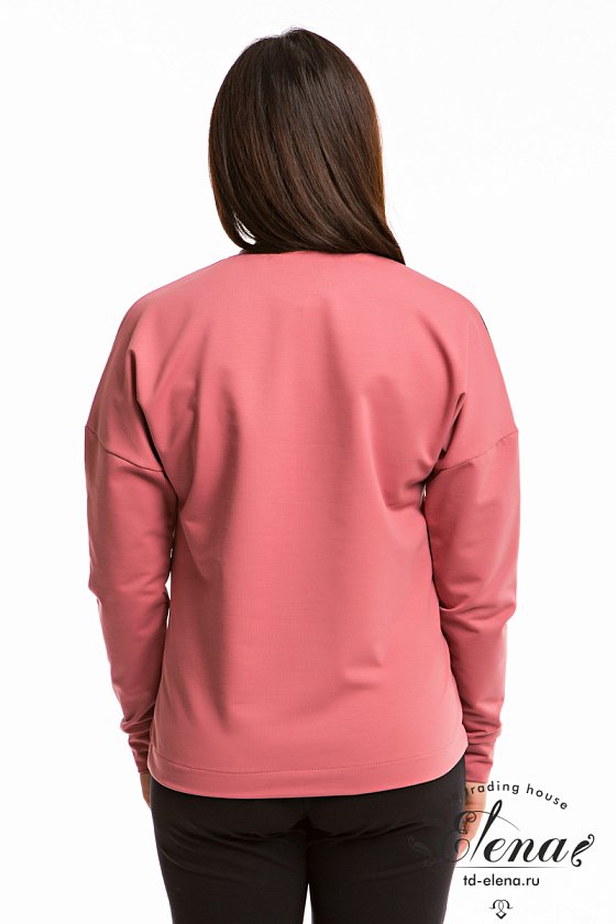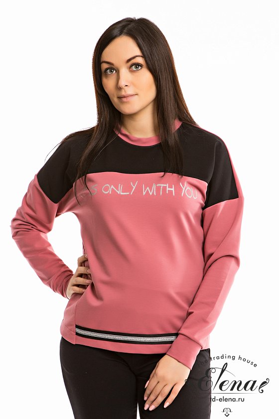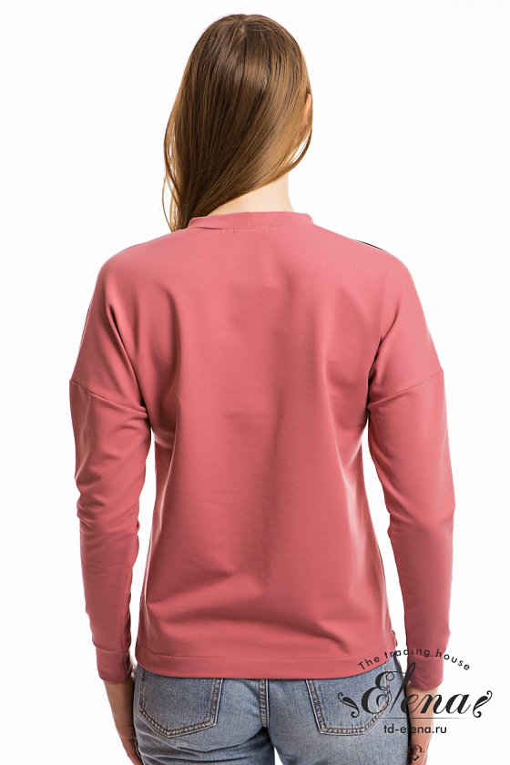 Толстовка выполнена из футер петли с лайкрой. Рукав длинный, спущенный, горловина имеет круглый вырез. В качестве отделки вставки из полотна контрастного цвета и лампасная тесьма по низу изделия. Спереди нанесён принт.