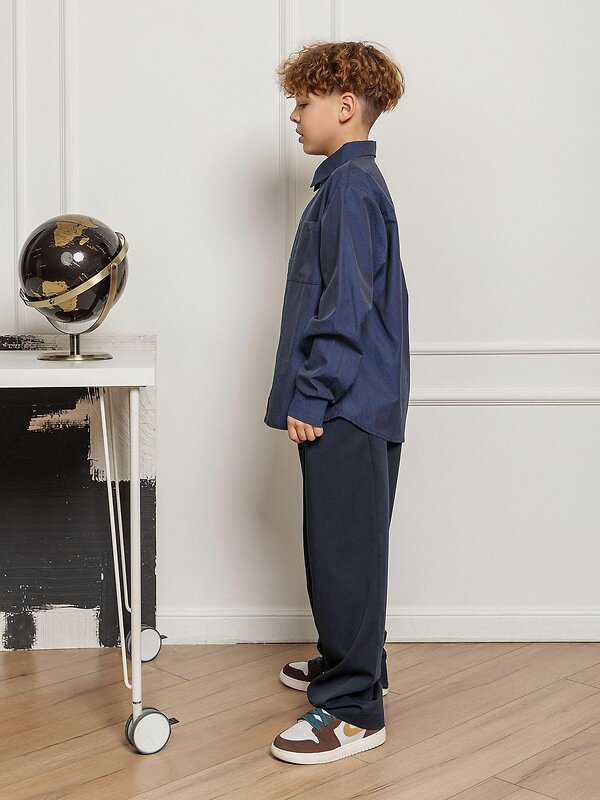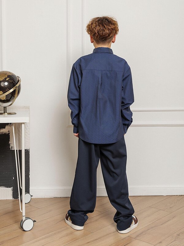 Классические брюки в школу для мальчика. Модный силуэт "банан" – свободный крой с аккуратными складками спереди для удобства и стильного вида. Практичная застёжка-гульфик обеспечивает аккуратную посадку и легкое надевание. Удобные боковые карманы – можно хранить важные мелочи. Качественная костюмная ткань – держит форму, не мнётся, приятна к телу. Универсальный темно-синий цвет – легко комбинируется с рубашками, футболками и свитерами. Идеальный выбор для школы, праздников и повседневной носки.