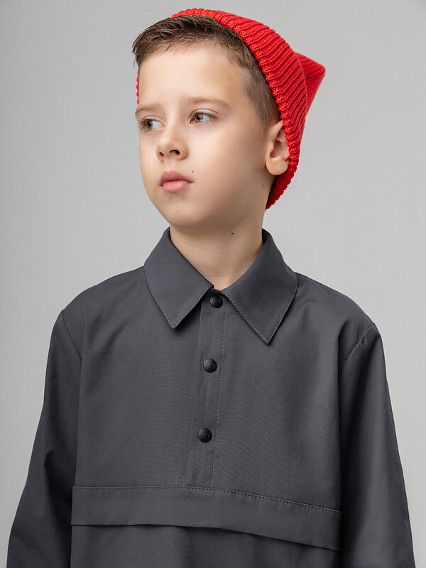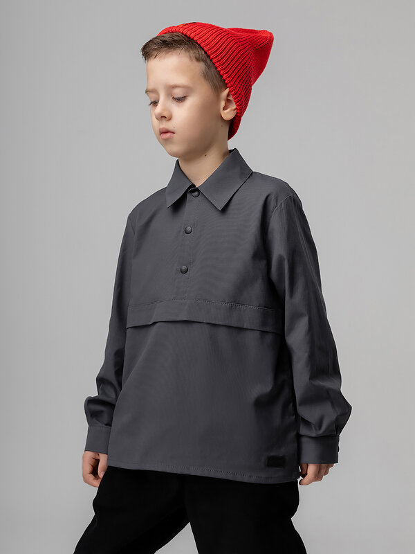 Рубашка для детей дошкольного возраста. Рубашка прямого силуэта, с центральной бортовой застёжкой на 3 кнопки, с отложным воротником, с втачными рукавами с притачной манжетой на кнопке. Низ изделия прямой. По низу рукава — защип.