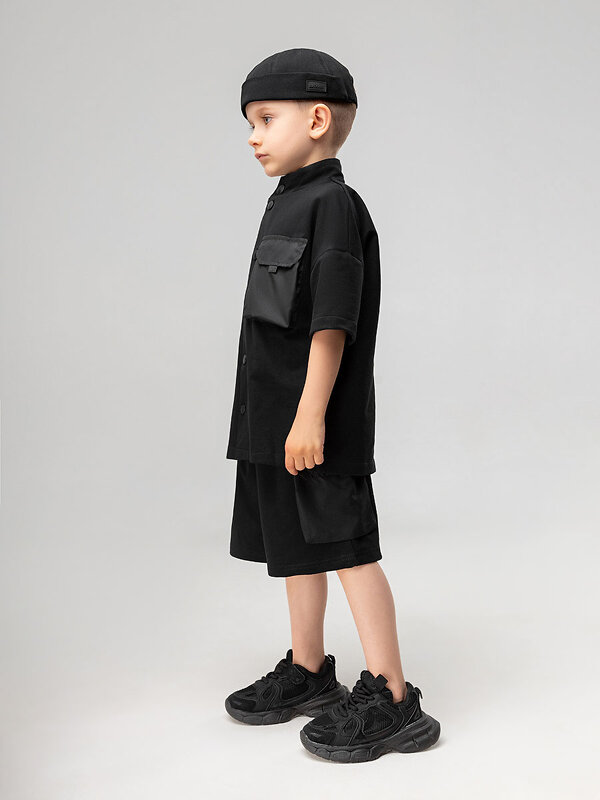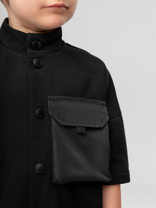 Рубашка прямого кроя на кнопках с коротким рукавом. Воротник стойка на кнопках. Спереди обьемный накладной карман из дюспы.