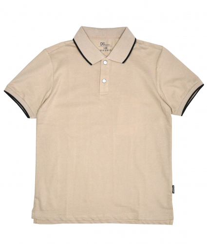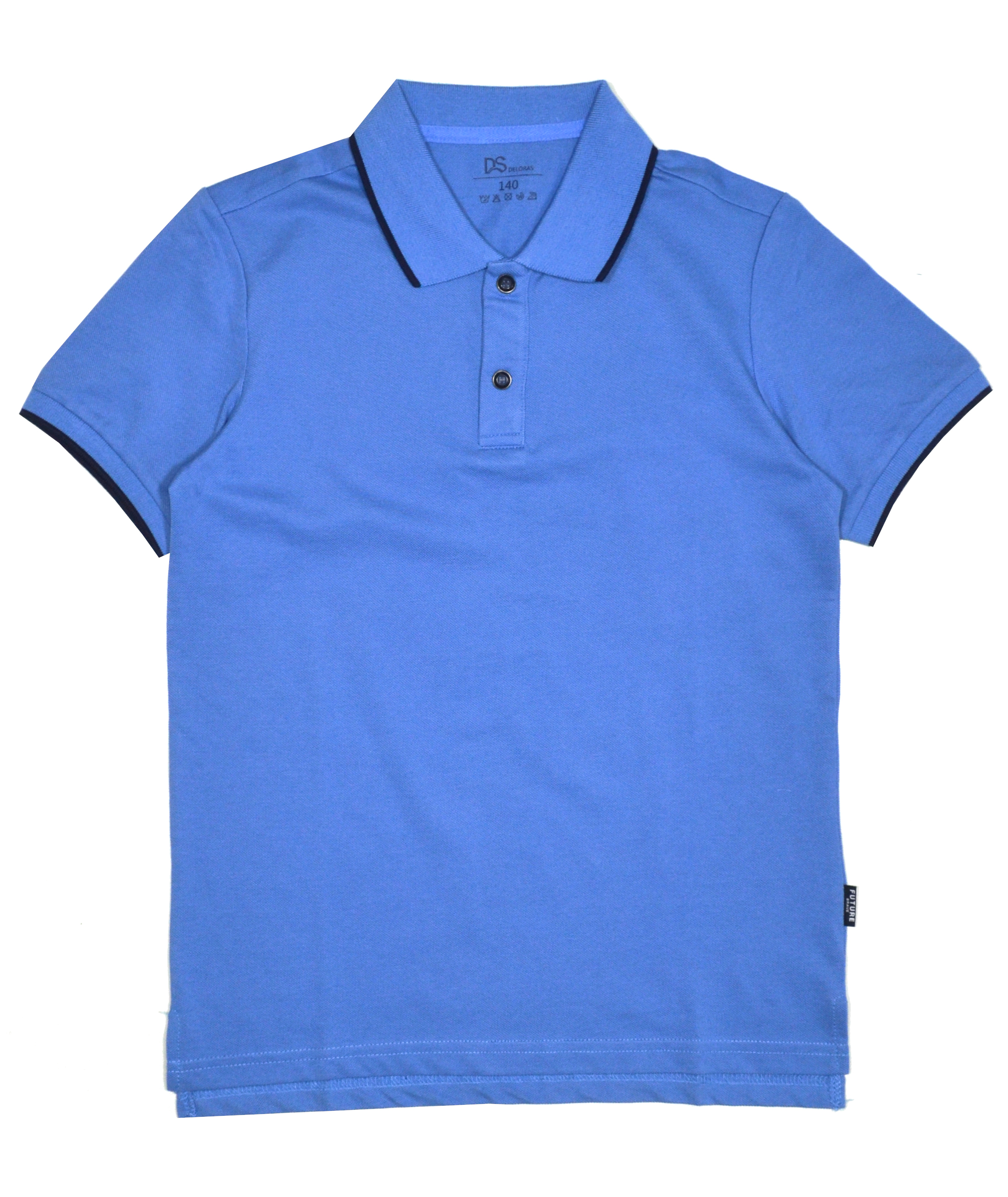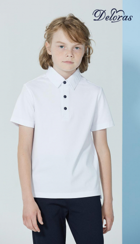 Классическое поло с коротким рукавом для мальчика. Застежка на кнопки по виду похожие на пуговицы.Ткань нового поколения, простая в обращении с гидрофобным покрытием. Покрытие противостоит жидкостям, т.е. жидкость скатывается с поверхности, отталкивает воду.  Воротник и манжеты из плотного трикотажа с добавление полосы темно-синего цвета.