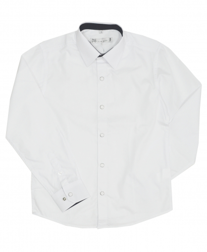 Классическая рубашка для мальчика. Застежка на кнопки, по виду похожие на пуговицы. По спинке вытачки. Подворотник и манжет из синей ткани. Материал высокого качества, гладкий и плотный, не просвечивает.