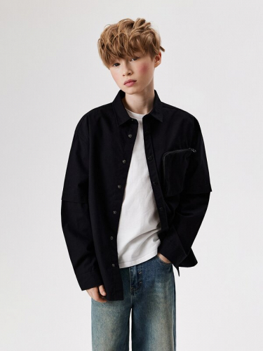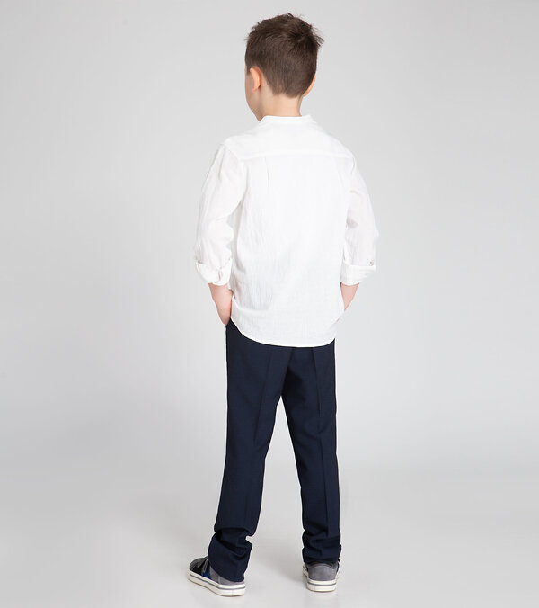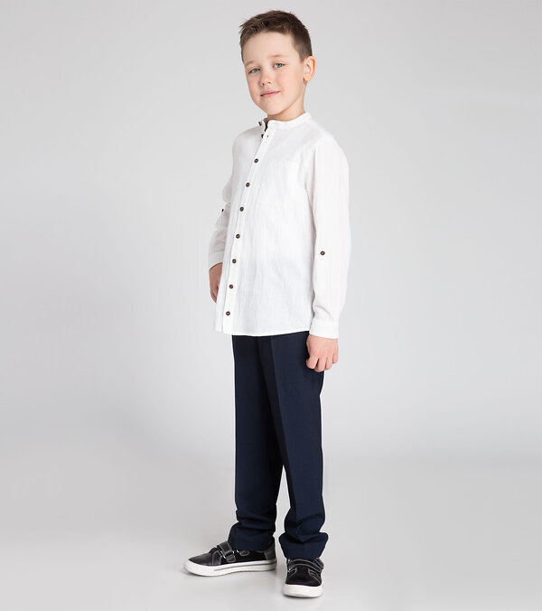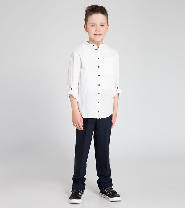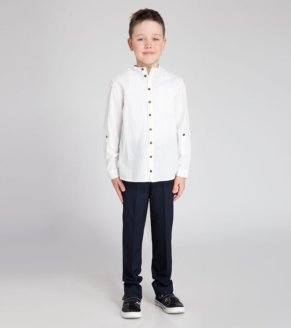 Сорочка верхняя для мальчика из хлопковой ткани. Силуэт сорочки прямой. Длинна сорочки до середины бедра. Сорочка с центральной застежкой на петли и пуговицы на переде. Так же на левой половинке переда расположен накладной карман. Горловина круглая, обработана отрезным воротником-стойкой. Рукава втачные, длинные, одношовные, с притачными манжетами. Разрезы рукавов обработаны планкой. На рукавах имеются паты, которые позволяют регулировать длину рукавов. Спинка сорочки с двойной кокеткой, частично переходящей на перед. Удобная и комфортная сорочка станет отличным вариантом для ежедневной носки, а так же свободного времяпрепровождения.Размер 30-122: Длина изделия - 47см, Длина рукава - 40см, Обхват шеи - 35см, Ширина плеча - 10см, Ширина по груди - 37см, Ширина по низу - 37см, Ширина рукава - 16см;