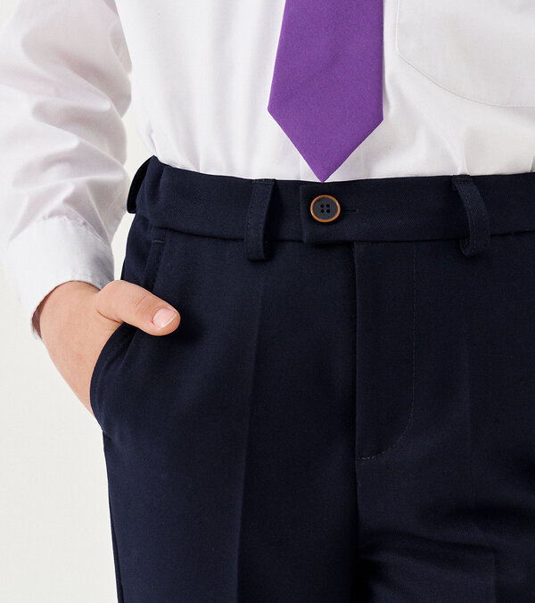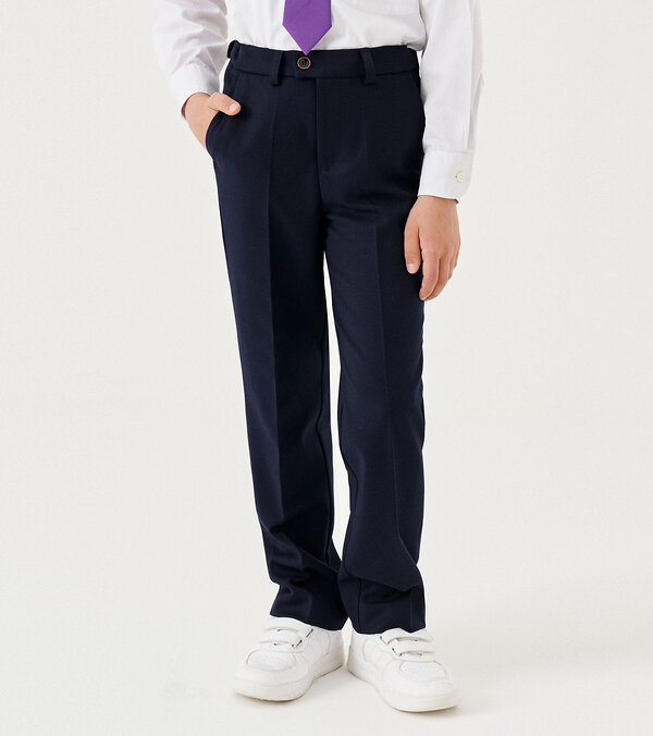 Классические прямые брюки для мальчика из поливискозной костюмной ткани. Брюки на поясе на талии. Застёжка на тесьму-молнию и петлю-пуговицу. По поясу вставлена резинка, имеются регуляторы--петли и пуговицы, что позволяет регулировать талию. На поясе имеются шлевки.В боковых швах имеются карманы. По задней половинке брюк вытачки и имитация прорезных карманов. Длина брюк классическая. Модные стильные брюки отличный вариант как для делового дресс кода, так и для повседневных дней.Размер 30-128: Высота посадки - 24см, Длина брюк с поясом - 77.5см, Длина по внутреннему шву - 56см, Ширина брючин сверху - 47см, Обхват брюк по низу - 31см, Ширина по бедрам - 34см, Ширина по талии - 24.5см;