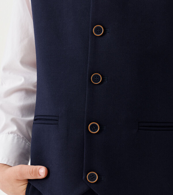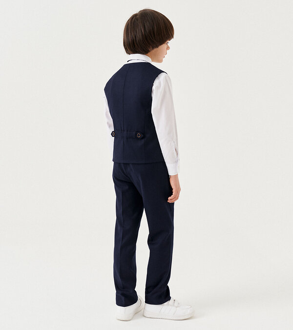 Классический жилет для мальчика полуприлегающего силуэта с центральной застежкой на пять петель и пуговиц, с V -образным вырезом горловины. Перед жилета цельный. По переду расположены боковые прорезные карманы в рамку. Спинка со средним швом и с рельефными швами, идущими от проймы до низа изделия. По спинке регулятор в виде кулиски с протянутой патой, застёгивающаяся на петлю-пуговицу. Пата внутри кулисы с резинкой. Жилет на подкладке.Размер 30-122: Длина изделия - 40см, Ширина плеча - 8см, Ширина по груди - 34см, Ширина по низу - 35см;