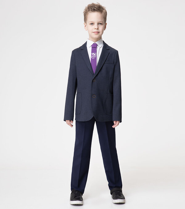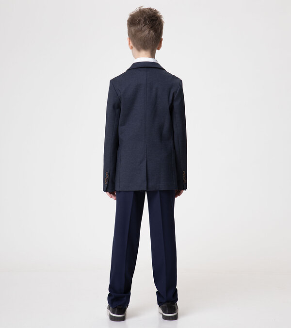 Пиджак для мальчика из трикотажного вискозного полотна. Пиджак полуприлегающего силуэта с центральной застежкой на две петли и пуговицы, с V- образным вырезом горловины, с втачными рукавами. Локтевые швы заканчиваются шлицами с декоративными пуговицами. Перед пиджака с отрезным бочком, с талиевыми вытачками. На переде расположены накладные карманы, обработанные подкладкой, а так же на левой полочке переда расположен нагрудный карман с листочкой. Спинка со средним швом. Воротник отложной пиджачного типа. Перед и рукава пиджака на вискозной подкладке. На левой внутренней части пиджака, на подборте, имеется внутренний карман в рамку с застежкой на пуговицу. Комфортный стильный пиджак станет отличным решением для ежедневной носки в школу.Размер 36-146: Длина изделия - 59см, Длина рукава - 55см, Ширина плеча - 11см, Ширина по груди - 43см, Ширина по низу - 45см, Ширина рукава - 16см;