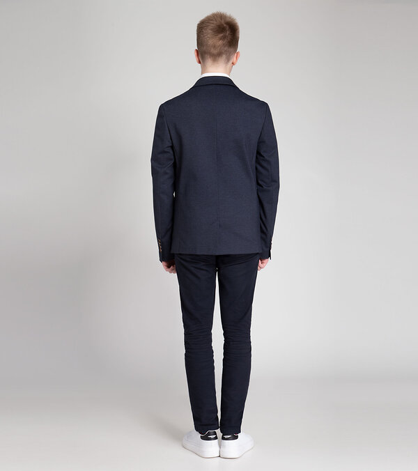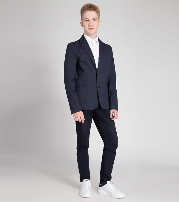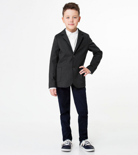 Пиджак для мальчика из трикотажного вискозного полотна. Пиджак полуприлегающего силуэта с центральной застежкой на две петли и пуговицы, с V- образным вырезом горловины, с втачными рукавами. Локтевые швы заканчиваются шлицами с декоративными пуговицами. Перед пиджака с отрезным бочком, с талиевыми вытачками. На переде расположены накладные карманы, обработанные подкладкой, а так же на левой полочке переда расположен нагрудный карман с листочкой. Спинка со средним швом. Воротник отложной пиджачного типа. Перед и рукава пиджака на вискозной подкладке. На левой внутренней части пиджака, на подборте, имеется внутренний карман в рамку с застежкой на пуговицу. Комфортный стильный пиджак станет отличным решением для ежедневной носки в школу.Размер 38-164: Длина изделия - 66см, Длина рукава - 61.5см, Ширина плеча - 14см, Ширина по груди - 45см, Ширина по низу - 46см, Ширина рукава - 15.5см;