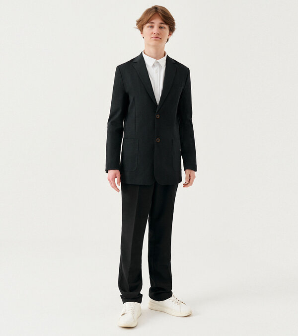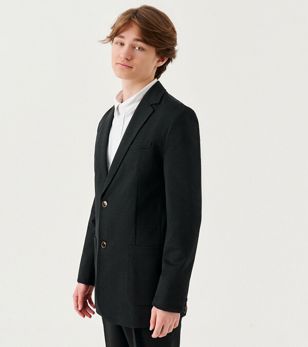 Пиджак для мальчика из трикотажного вискозного полотна. Пиджак полуприлегающего силуэта с центральной застежкой на две петли и пуговицы, с V- образным вырезом горловины, с втачными рукавами. Локтевые швы заканчиваются шлицами с декоративными пуговицами. Перед пиджака с отрезным бочком, с талиевыми вытачками. На переде расположены накладные карманы, обработанные подкладкой, а так же на левой полочке переда расположен нагрудный карман с листочкой. Спинка со средним швом. Воротник отложной пиджачного типа. Перед и рукава пиджака на вискозной подкладке. На левой внутренней части пиджака, на подборте, имеется внутренний карман в рамку с застежкой на пуговицу. Комфортный стильный пиджак станет отличным решением для ежедневной носки в школу.Размер 44-182,188: Длина изделия - 76см, Длина рукава - 69.5см, Ширина плеча - 15.5см, Ширина по груди - 51см, Ширина по низу - 51см, Ширина рукава - 17.5см;