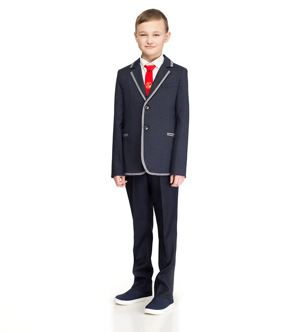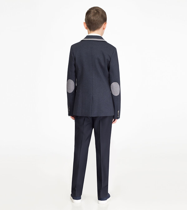 Строгий пиджак для мальчика из трикотажного полотна на вискозной подкладки. Пиджак полуприлегающего силуэта, удлиненный, с центральной застежкой на две петли и пуговицы до перегиба лацкана.Детали переда с отрезными бочками, передними вытачками и боковыми прорезными карманами в рамку. На левой детали переда верхний прорезной карман с листочкой. Спинка со средним швом, заканчивающимся шлицей. Рукава втачные двухшовные, локтевые швы заканчиваются шлицами. На шлицах по четыре отделочные петли и пуговицы. Воротник пиджачного типа с тупыми концами. Пиджак с притачной по низу подкладкой. На деталях подкладки обработан внутренний карман и вешалка. Край воротника, лацкана, борта обработан притачным кантом.Размер 32-134: Длина изделия - 51см, Длина рукава - 49см, Ширина плеча - 10см, Ширина по груди - 36см, Ширина по низу - 37см, Ширина рукава - 13.5см;