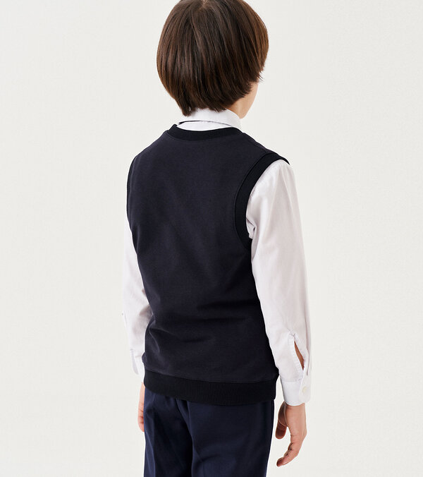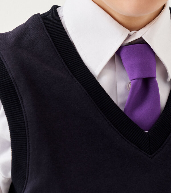 Жилет для мальчика из хлопчатобумажной ткани для повседневной носки. Жилет полуприлегающего силуэта. Низ изделия обработан слегка тянущимся довязом. Горловина V-образная, обработана слегка тянущимся довязом. Жилет без рукавов, пройма обработана слегка тянущимся довязом. Изделие классической длины. Отличный вариант для вашего ребенка. В данной жилетке он будет выглядеть модно, а главное изделие будет комфортное в носке.Размер 32-128: Длина изделия - 48см, Ширина плеча - 9.5см, Ширина по груди - 37см, Ширина по низу - 34см;
