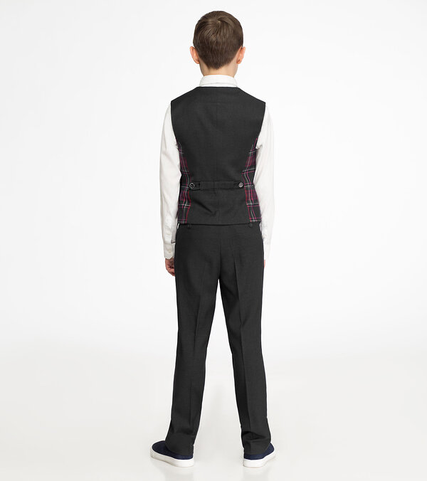 Жилет для мальчика полуприлегающего силуэта с центральной застежкой на четыре петли и пуговицы, с V -образным вырезом горловины. Перед жилета цельный. На боковых частях переда расположены боковые прорезные карманы в рамку. Спинка со средним швом и с рельефными швами, идущими от проймы до низа изделия. По спинке регулятор. Жилет на подкладке.Размер 30-116: Длина изделия - 45см, Ширина плеча - 9см, Ширина по бедрам - 39см, Ширина по груди - 36см, Ширина по низу - 35см;