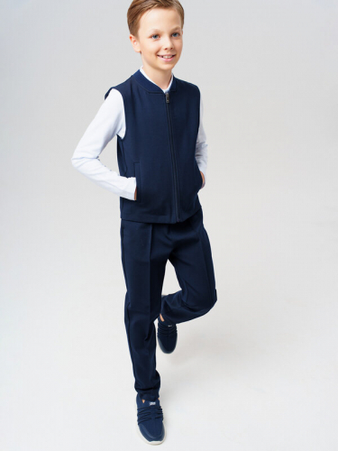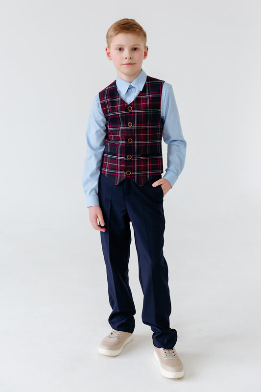 Классический жилет для мальчика полуприлегающего силуэта с центральной застежкой на пять петель и пуговиц, с V -образным вырезом горловины.
