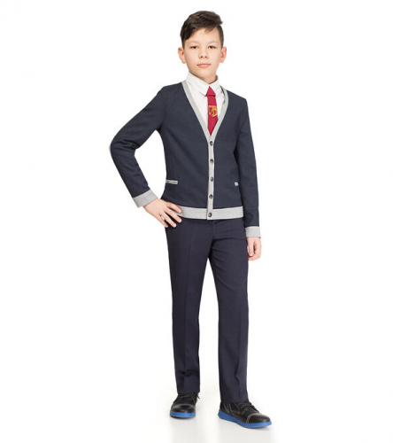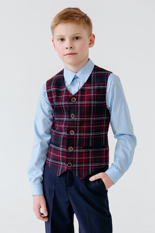 Классический жилет для мальчика полуприлегающего силуэта с центральной застежкой на шесть петель и пуговиц, с V -образным вырезом горловины.