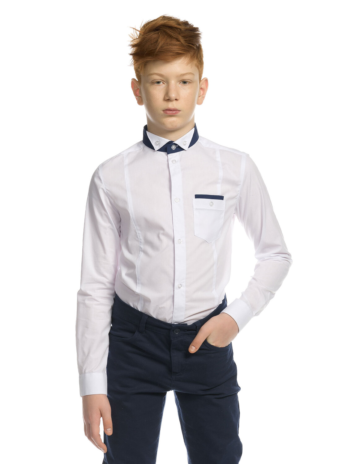 Рубашка для мальчиков с длинным рукавом. Сорочка прилегающего силуэта с вертикальными рельефами на переде и спинке. Воротник классическая невысокая стойка из ткани контрастного цвета, с отгибающимися уголками в цвет основной ткани, пристегивающимися на пуговицы к стойке. Карман с имитацией выглядывающего платка в цвет воротника-стойки.