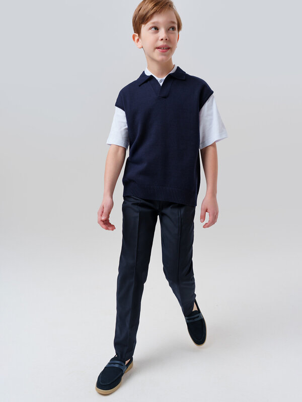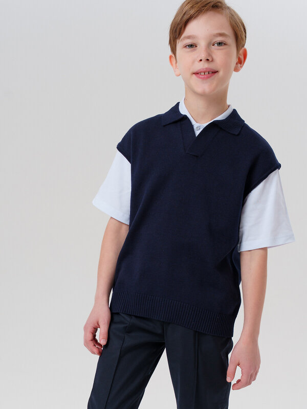 Этот модный жилет для школы станет универсальным элементом гардероба юного стиляги. Модель выполнена в comfort силуэте – свободный крой обеспечивает комфорт в движении и современный внешний вид.