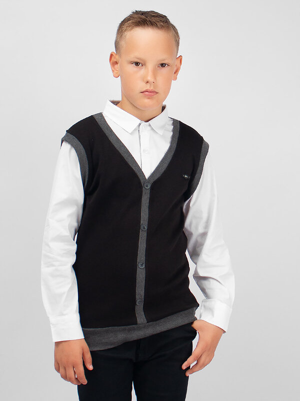 Джемпер-обманка с имитацией рубашки. Жилет с V-образным вырезом, выполнен из мягкого, приятного к телу трикотажа. По низу изделия - манжет. Имитация рубашки так же выполнена из натурального материала, на груди застегивается на две пуговицы. Идеальный выбор для создания классического школьного образа.