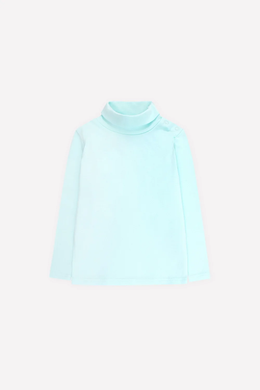 Однотонная детская водолазка из хлопкового трикотажа интерлок пенье. Длинные рукава. Высокая горловина с отворотом, в области плеча предусмотрена застежка на кнопки-ободок.