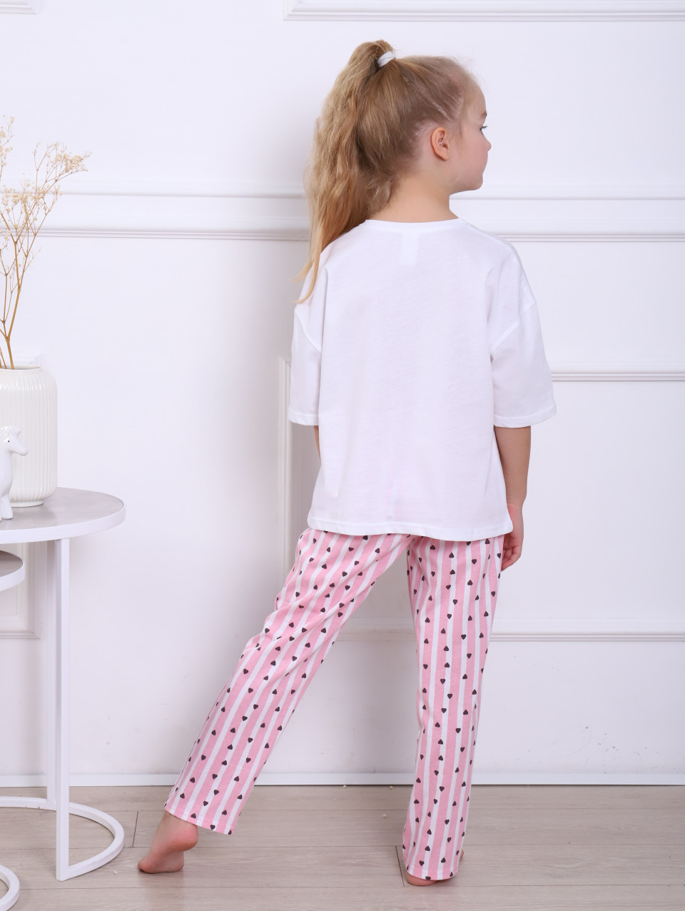 Пижама для девочки с брюками с принтом сердечки. Комплект для дома представляет собой брюки и футболка. Домашние штаны прямого кроя, свободные. Брючки на мягкой широкой эластичной резинке, которая не передавливает кожу, подстраивается положение тела ребенка и его движения, обеспечивает комфорт на целый день. Домашняя футболка прямого кроя, имеет округлый вырез горловины, с рисунком. Домашний костюм детский изготовлен из нежного трикотажного полотна высокого качества из натурального гипоаллергенного 100% хлопка, хб. Детская пижамка подойдет не только для сна, ее можно использовать как одежду для дома.