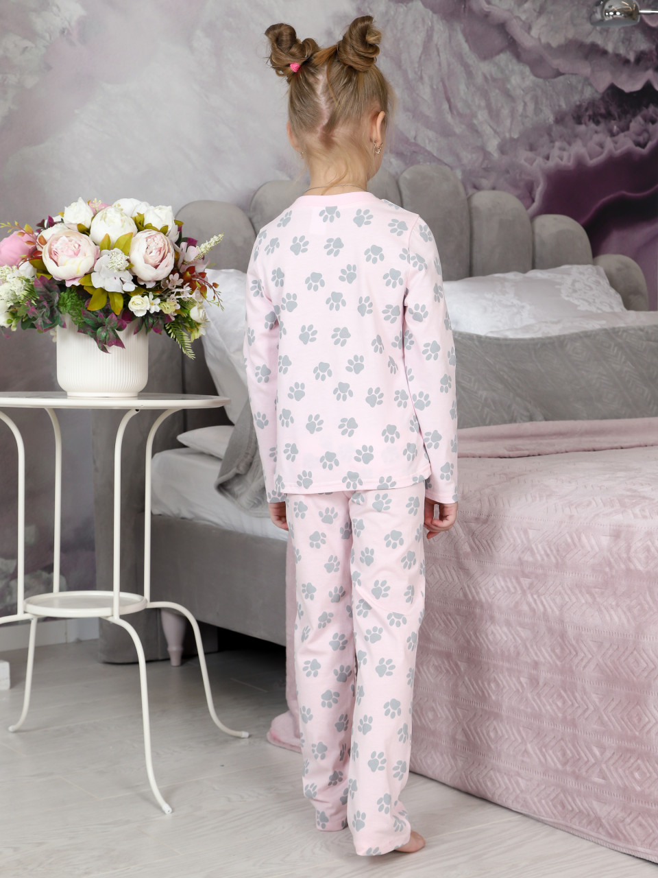 Хлопковая пижама для девочки. Пижама состоит из кофты с длинными рукавами и брюки. Домашний комплект отлично подойдет для комфортного сна. Ткань легкая и мягкая,что позволяет коже дышать. Хлопковая кофта с длинными рукавами, оформленными манжетами, с отрезной кокеткой и милым принтом на полочке.