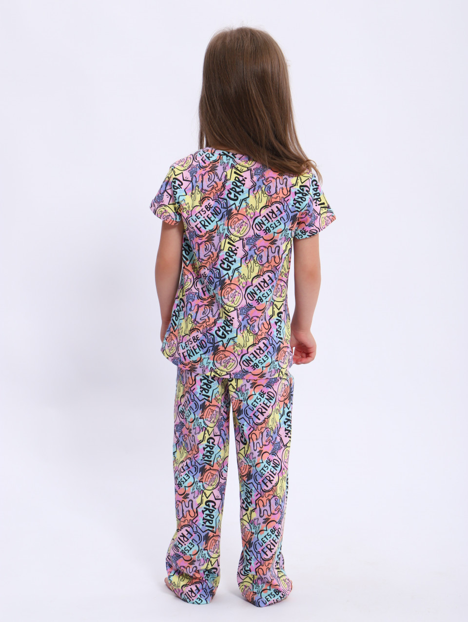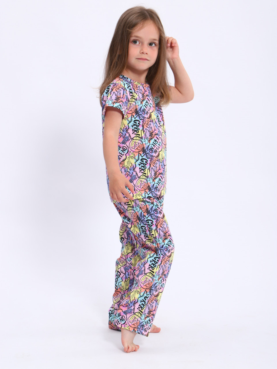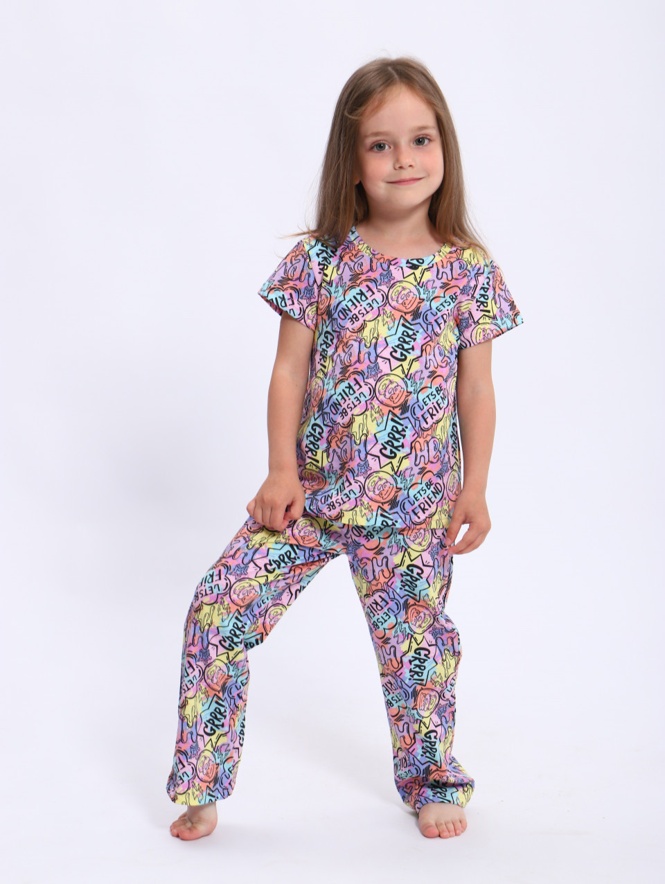 Пижама изготовлена из хлопковой кулирки - гладкой и легкой натуральной ткани, которая приятна на ощупь и обеспечивает хорошую вентиляцию. Это 100% хлопок, что делает эту пижаму безопасной и гипоаллергенной для кожи вашей девочки. Эта пижама не только идеально подходит для сна, но и может быть использована как нарядный домашний костюм для девочки. Она подчеркнет ее стиль и индивидуальность, добавляя уют и комфорт в домашнюю обстановку.