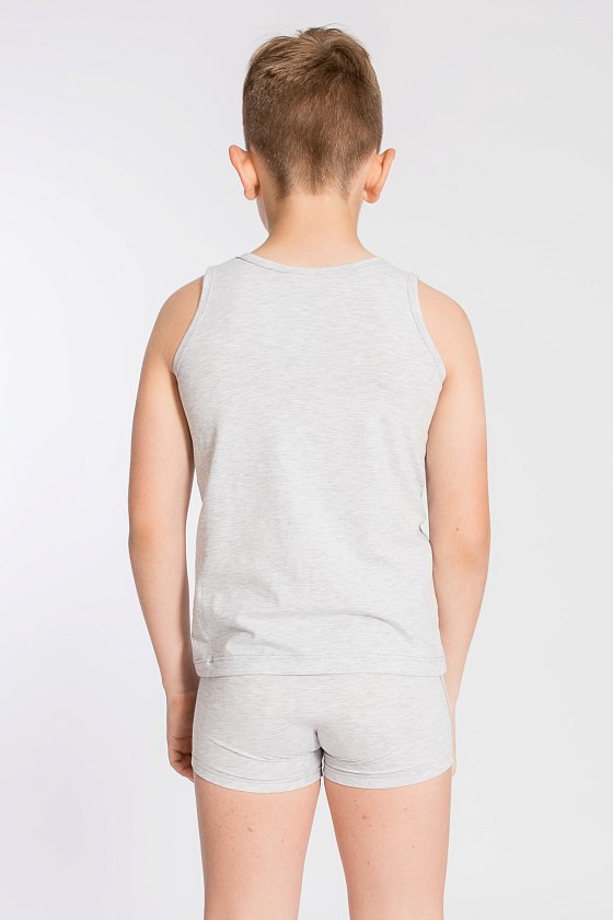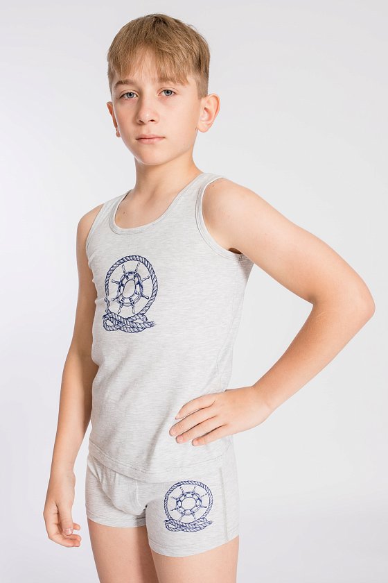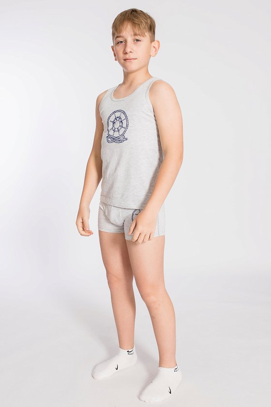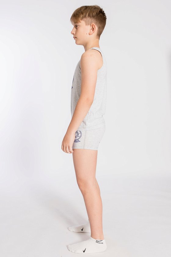 Комплект на мальчика майка и боксеры выполнен из хлопкового полотна с добавлением лайкры. Майка с широкими бретелями, обработанными бейкой. Боксеры с отделочной резинкой по поясу. На майке и боксерах спереди нанесён принт .