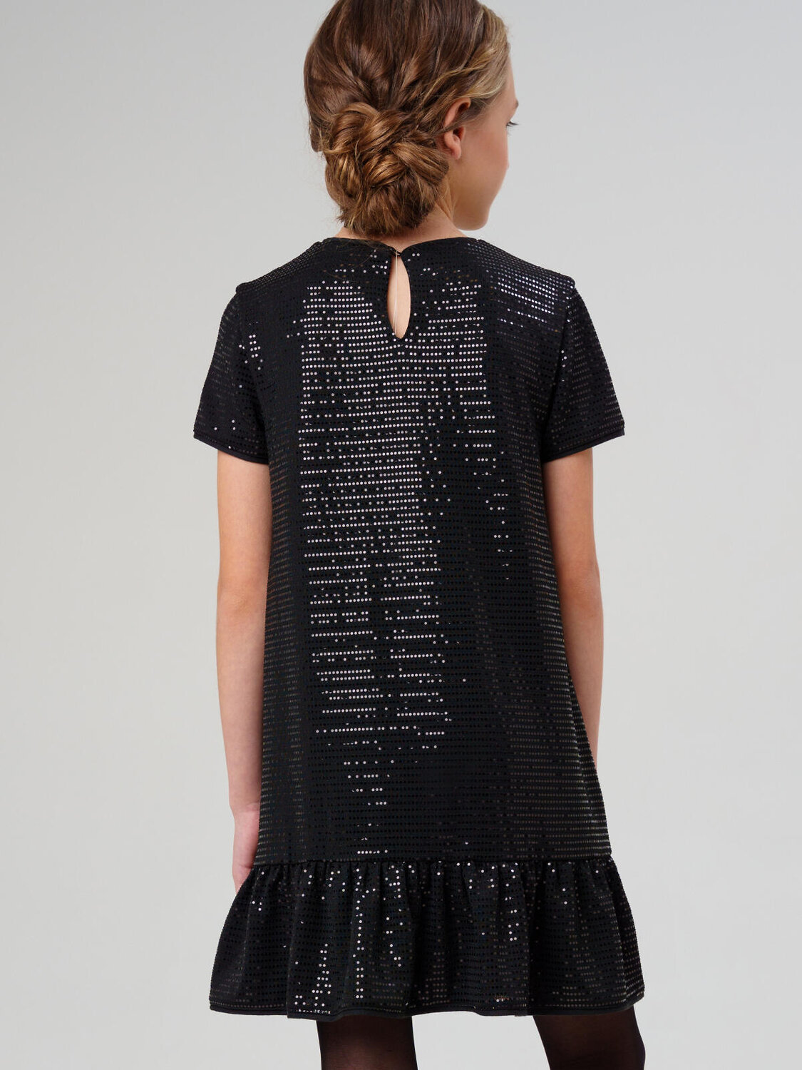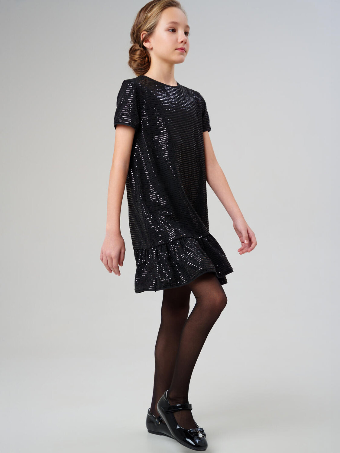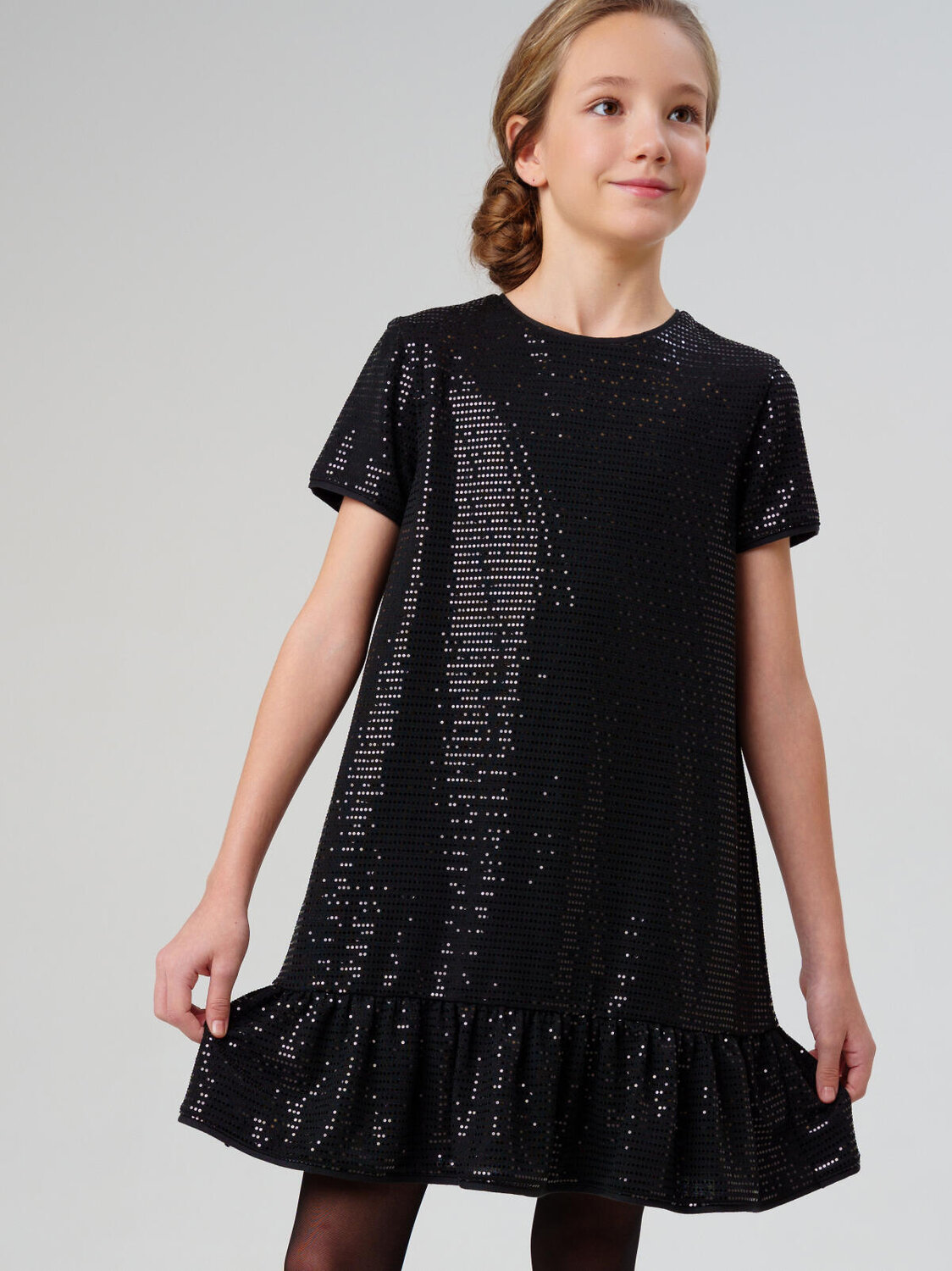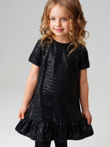 Модное чёрное платье для девочки от PlayToday — стильная модель для праздников и особых случаев. Платье выполнено из мягкого трикотажа с мерцающими пайетками, которые создают эффектное сияние при движении. Укороченный рукав и волан по низу добавляют лёгкости и женственности силуэту.