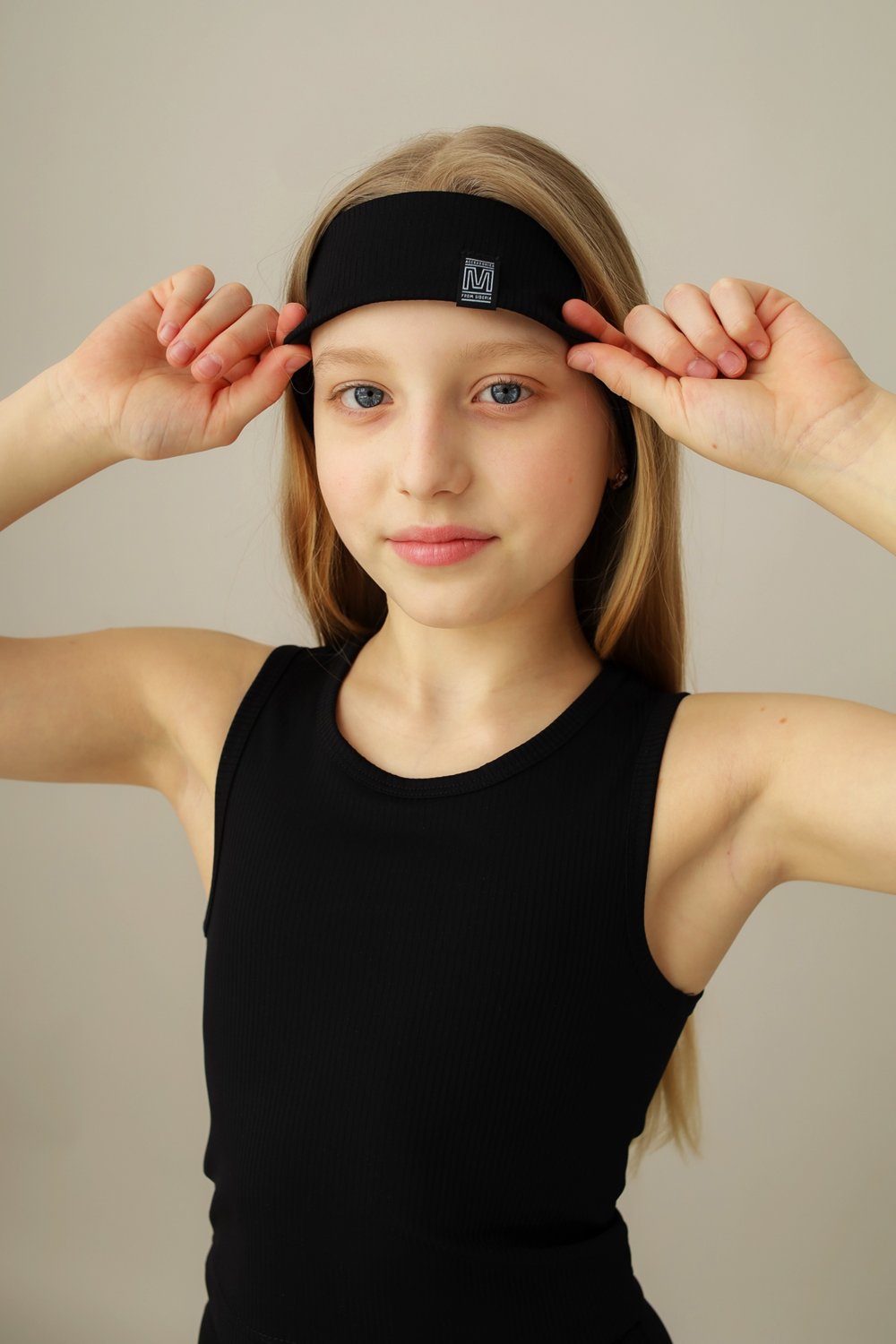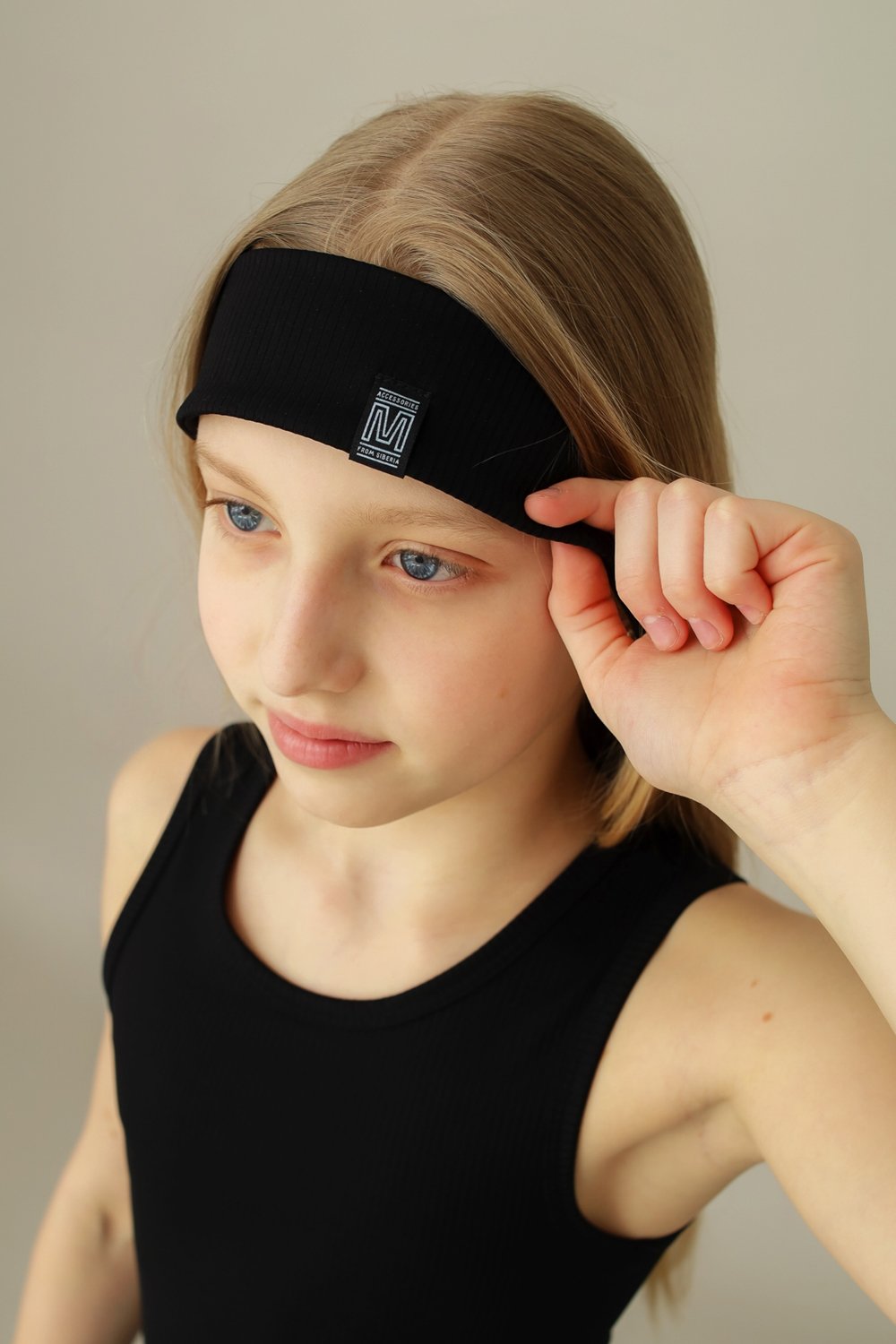 Повязка на лоб из спортивного трикотажа. Нашивка-прищепка по нижнему краю. Ширина 5 см.