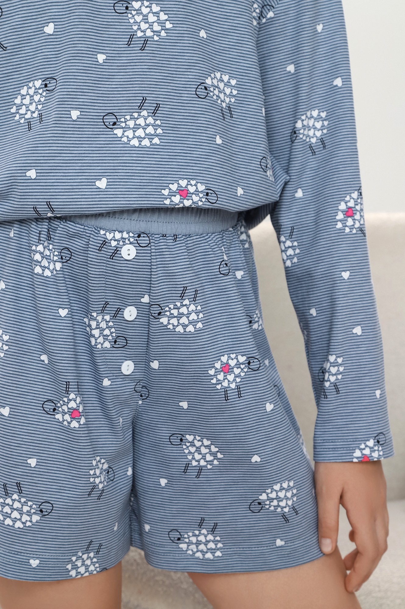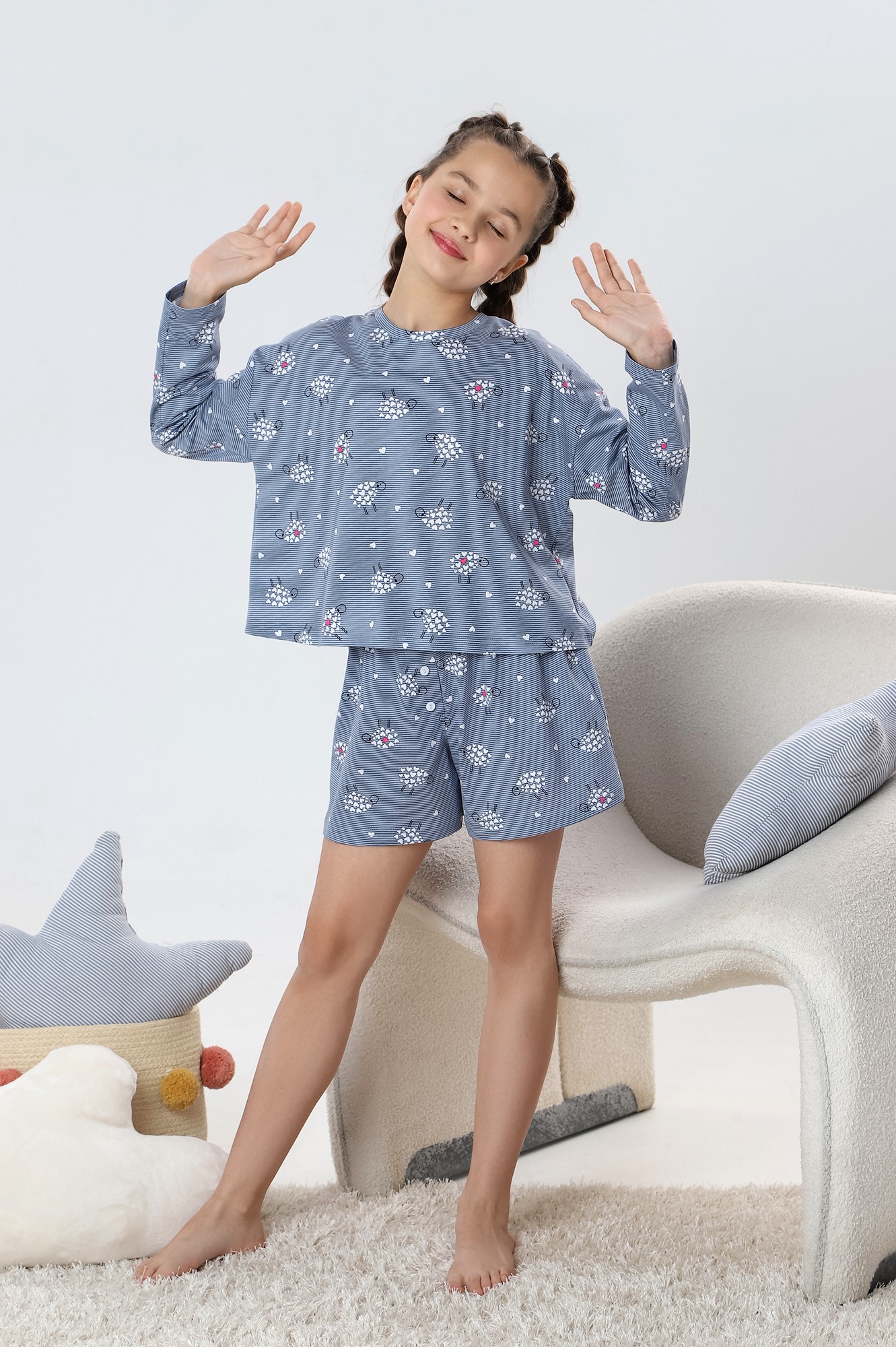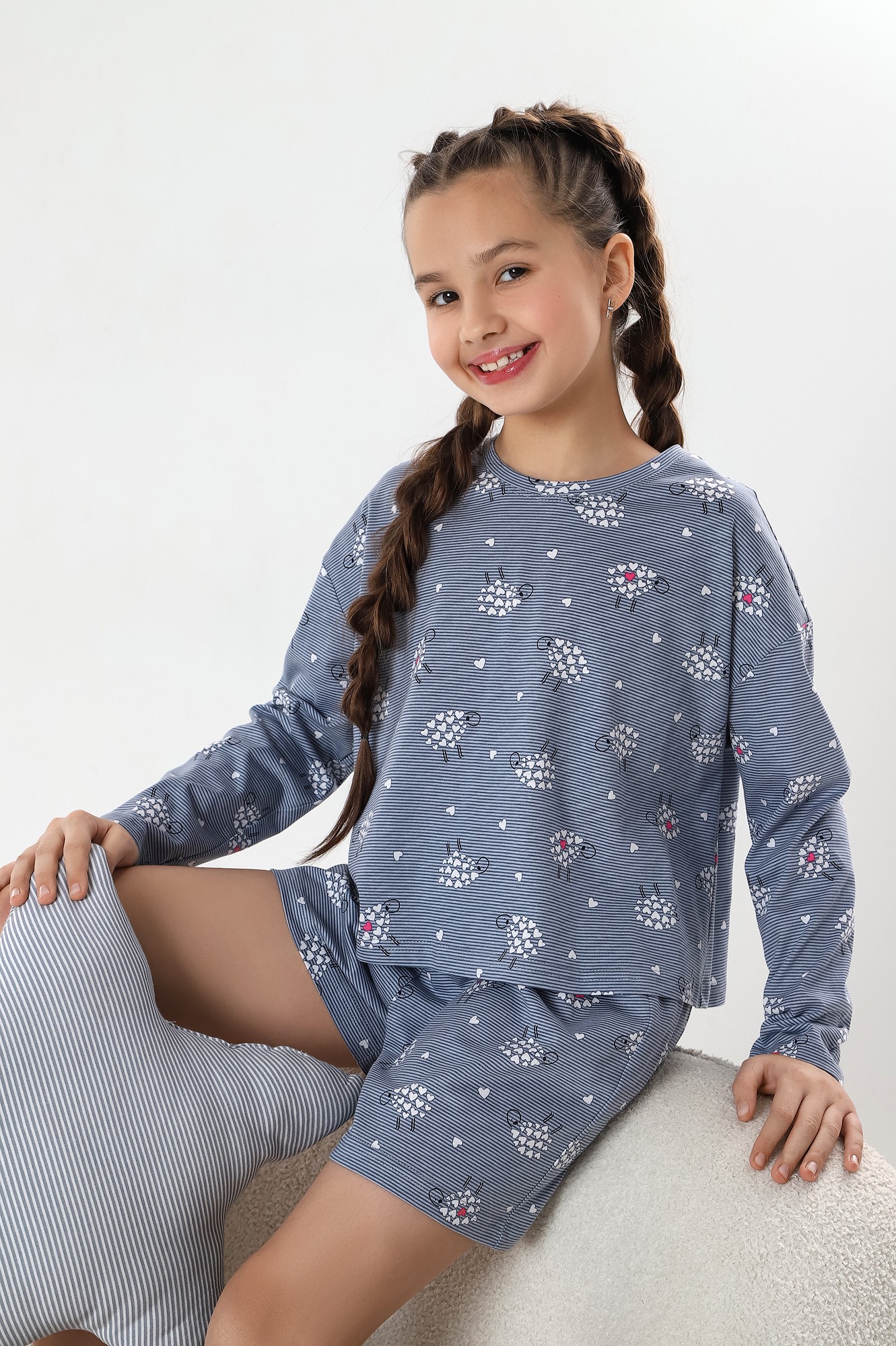 Костюм для девочки, состоящий из джемпера и и шорт. Джемпер - из гладкокрашеного полотна, с принтом в центре переда, свободного покроя, укороченный, с длинными втачными рукавами и горловиной овальной формы, обработанной втачной планкой. По шву втачивания планки настрочена отделочная строчка. Шорты - из полотна с набивным рисунком, средней длины, на притачном поясе с эластичной тесьмой внутри. Средний шов переда выполнен с имитацией застежки "гульфик" с тремя декоративными пуговицами.