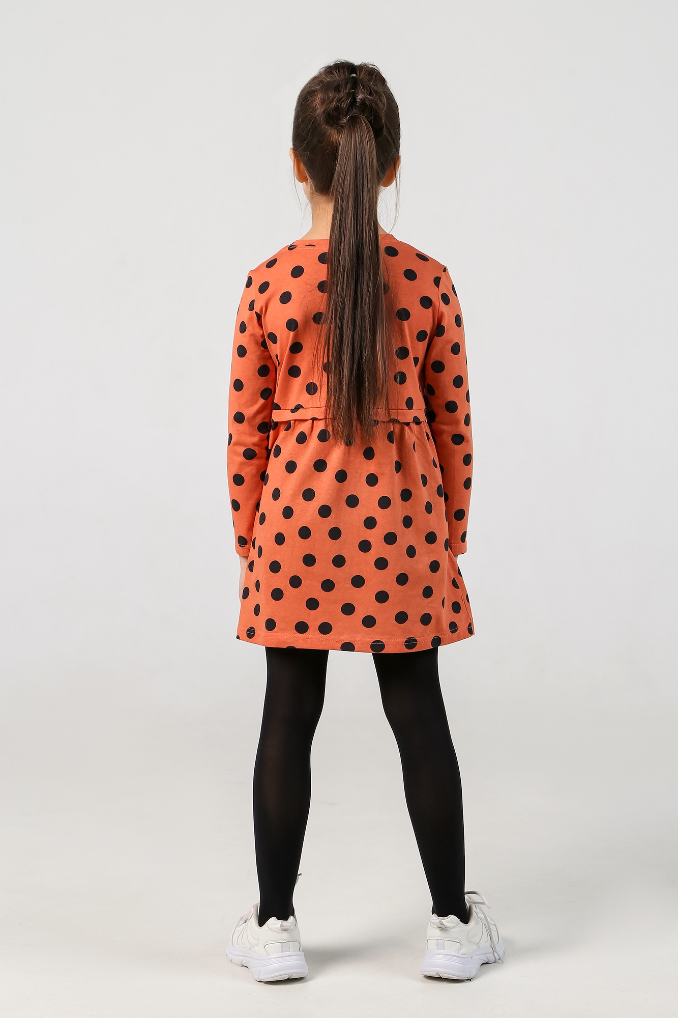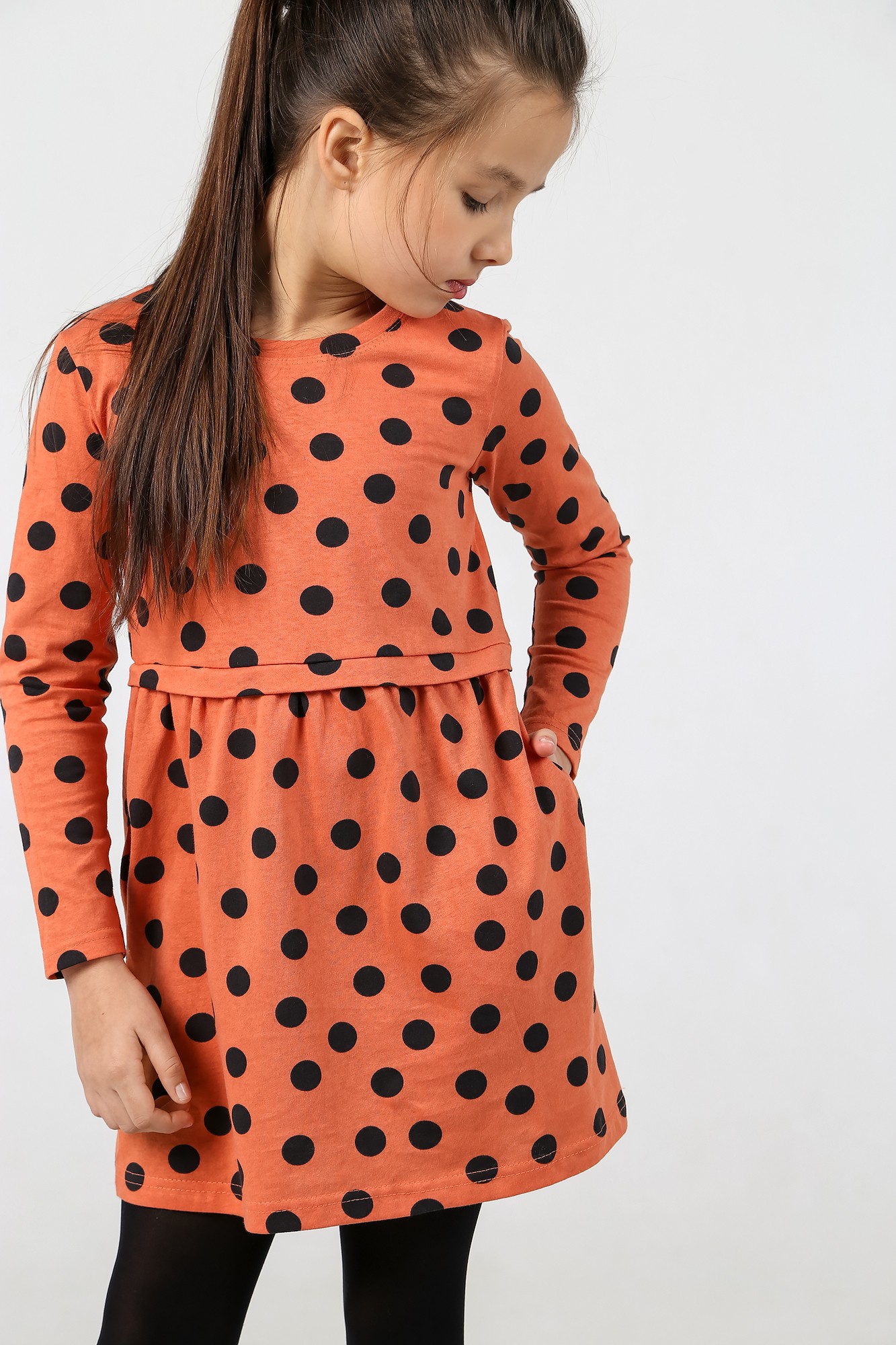 Платье для девочки х/б полотна кулирного переплетения с набивным рисунком. Модель длиной выше колен, с отрезной присборенной по верху юбкой, с карманами в боковых швах и декоративной планкой по линии талии. Рукава длинные, базового покроя.
