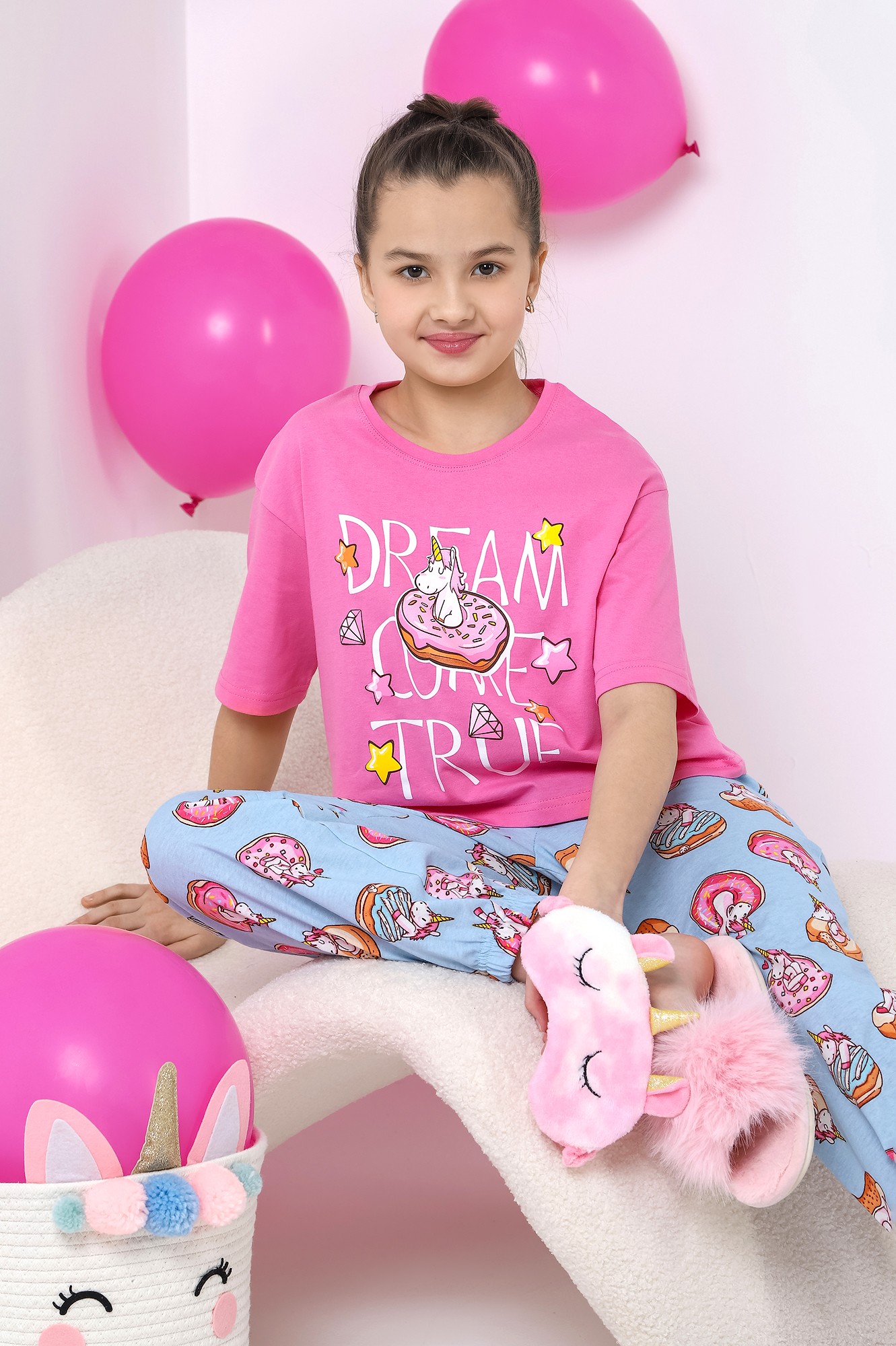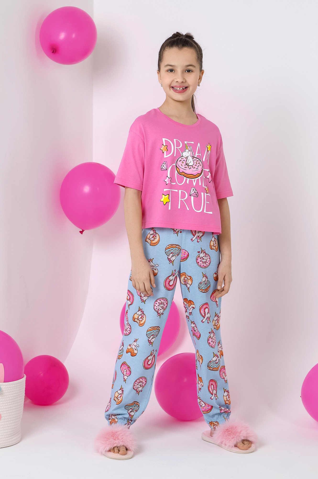 Пижама для девочки из трикотажного полотна "кулирка", состоящая из футболки и брюк. Футболка - из гладкокрашеного полотна, слега расширенная и укороченная, с втачными короткими рукавами, горловиной овальной формы, обработанной втачной планкой и принтом в центре переда, выполненным в технике шелкографии. Брюки из полотна с набивным тематическим рисунком, длинные, с эластичной тесьмой по талии и нижним срезами.