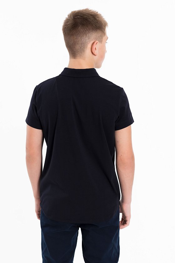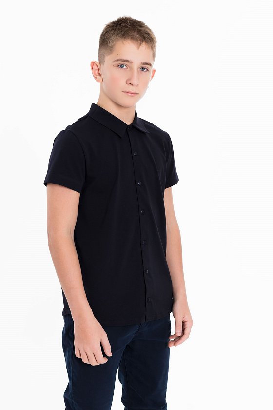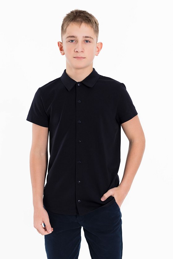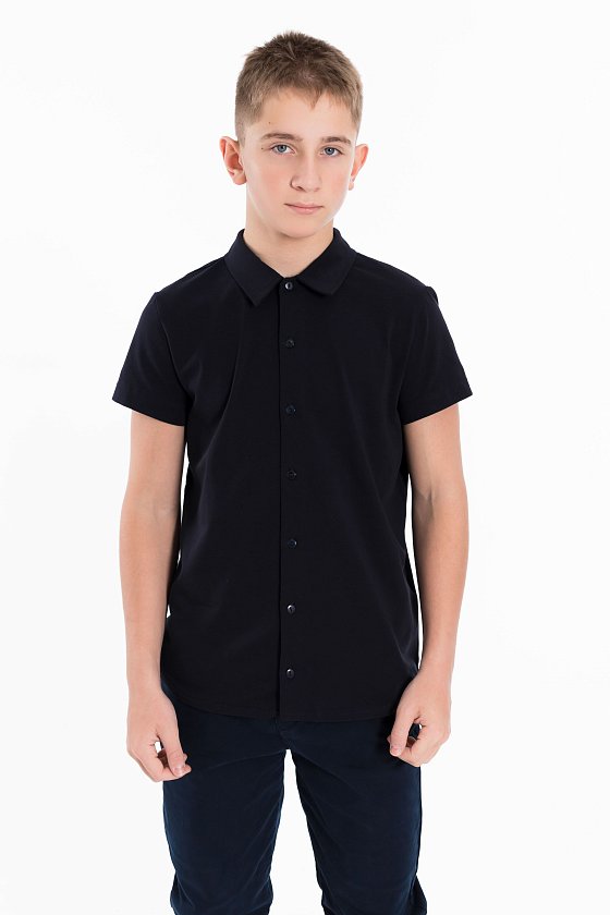 Синяя рубашка с коротким рукавом из материала кулирка с лайкрой и застёжкой на пуговицы — отличный выбор для школьника. Обеспечивает свободу движений, комфорт и аккуратный внешний вид. Воротник придаёт изделию стильный вид.