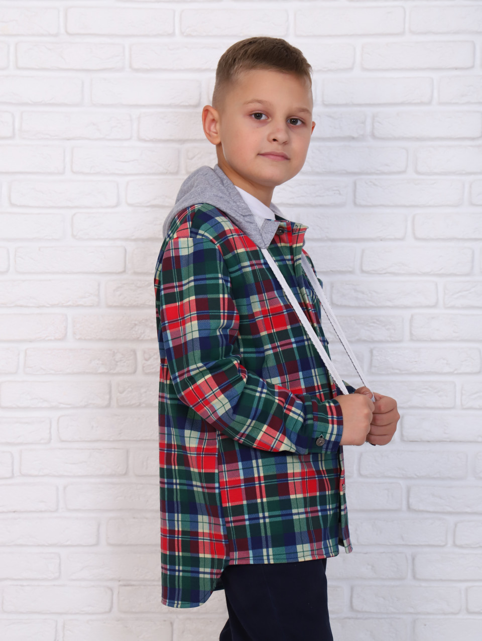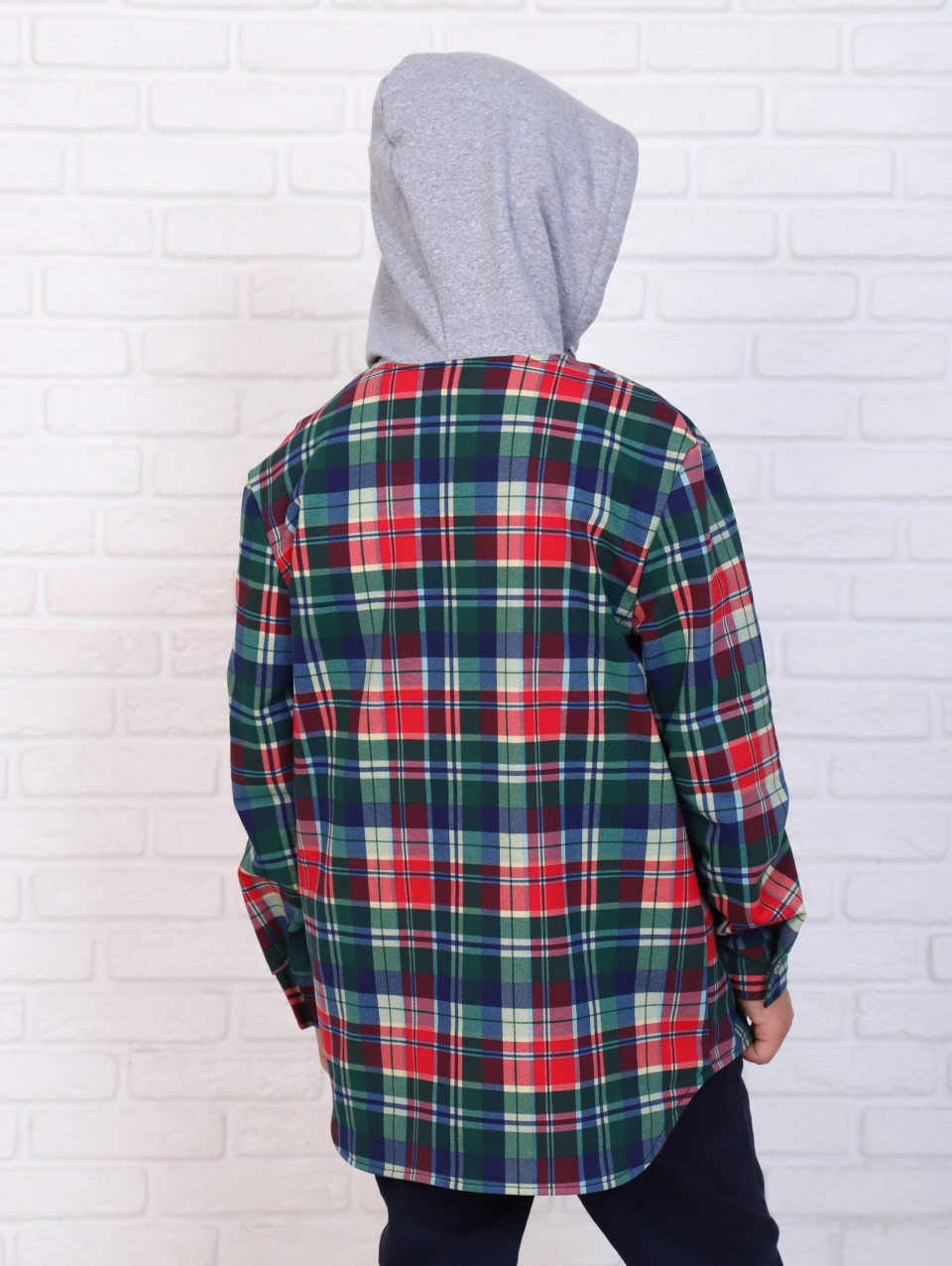 Детская рубашка с начесом. Рубашка в клетку удлиненная на пуговицах и с капюшоном на завязках. Толстовка детская утепленная с длинными спущенными рукавами на манжете, на груди накладной карман. Изготовлена из натурального гипоаллергенного 100% хлопка, материал - футер с начёсом. Кофта с пуговицами подойдет для занятий спортом, его можно использовать как одежду для дома, как домашний костюм, в школу, повседневный костюм - одежда для улицы на каждый день, костюм на дачу, как курточку в прохладную погоду. Базовая детская вещь незаменимая для детского гардероба.